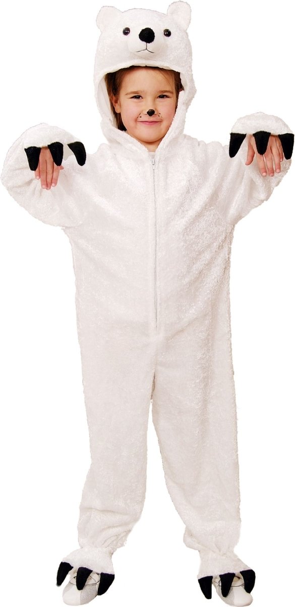 Deze pluche ijsbeer overall met kap heeft een ritssluiting aan de voorkant en is een compleet verkleedkostuum voor themafeesten of cosplay.