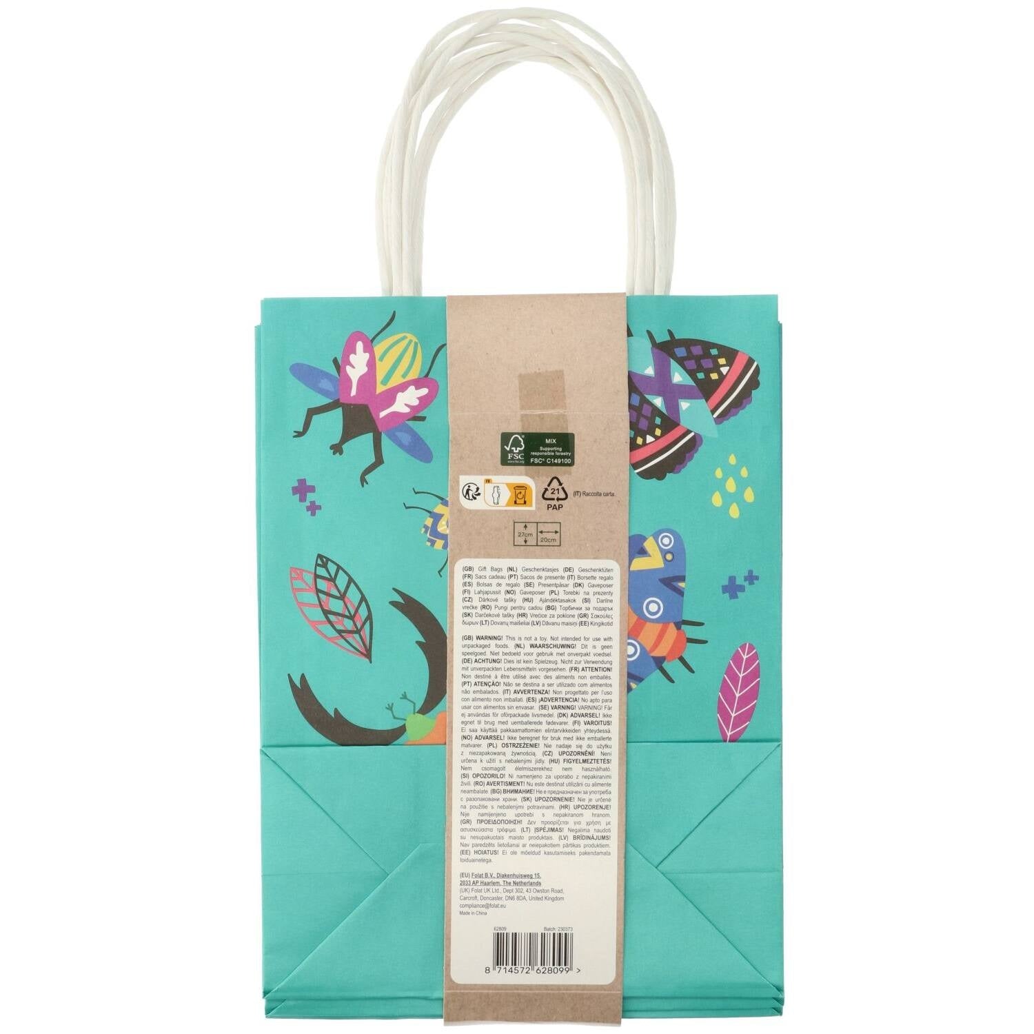 Overal beestjes! Geschenktasjes - Buzzing Bugs - 20x 27x 10 cm - 6 stuks. Inhoud: 6 cadeautasjes. Bijvoorbeeld te gebruiken tijdens de volgende feestgelegenheid/feestgelegenheden: Kinderfeestje, Verjaardag. Turquoise geschenktasjes met het Buzzing Bugs patroon. De tasjes zijn 20 x 27 x 10 cm. Inclusief hengsel zijn de tastjes 37 cm hoog. Deze geschenktasjes horen bij de Buzzing Bugs collectie van Folat. Dit artikel is gemaakt van FSC papier.