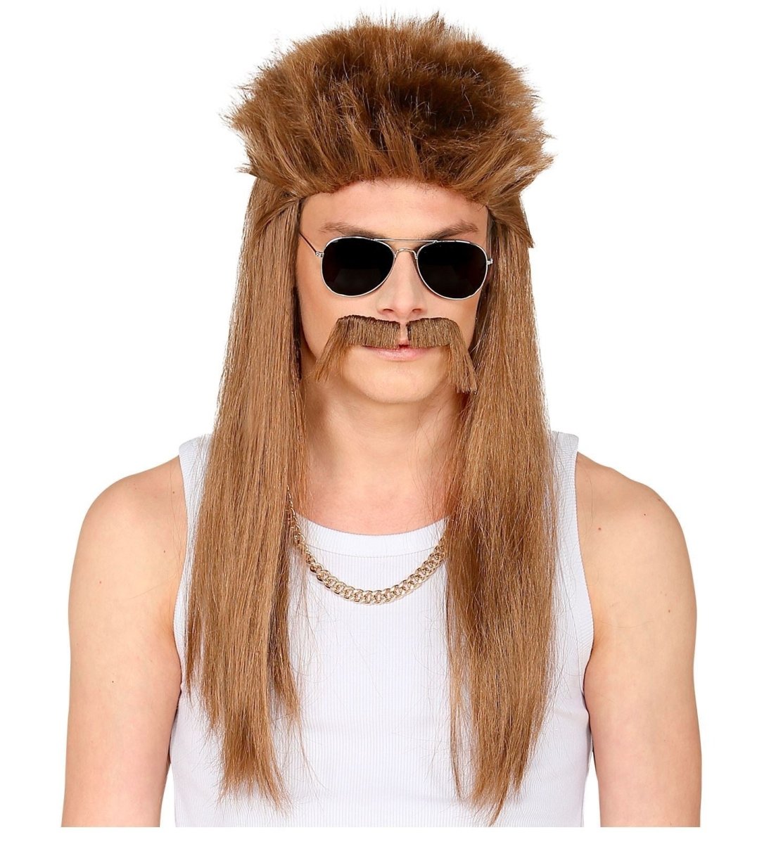 Omschrijving: Jaren 80 Pruik Aso Bruin met Snor