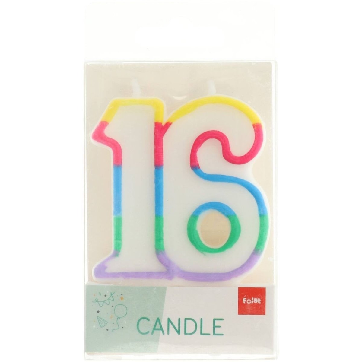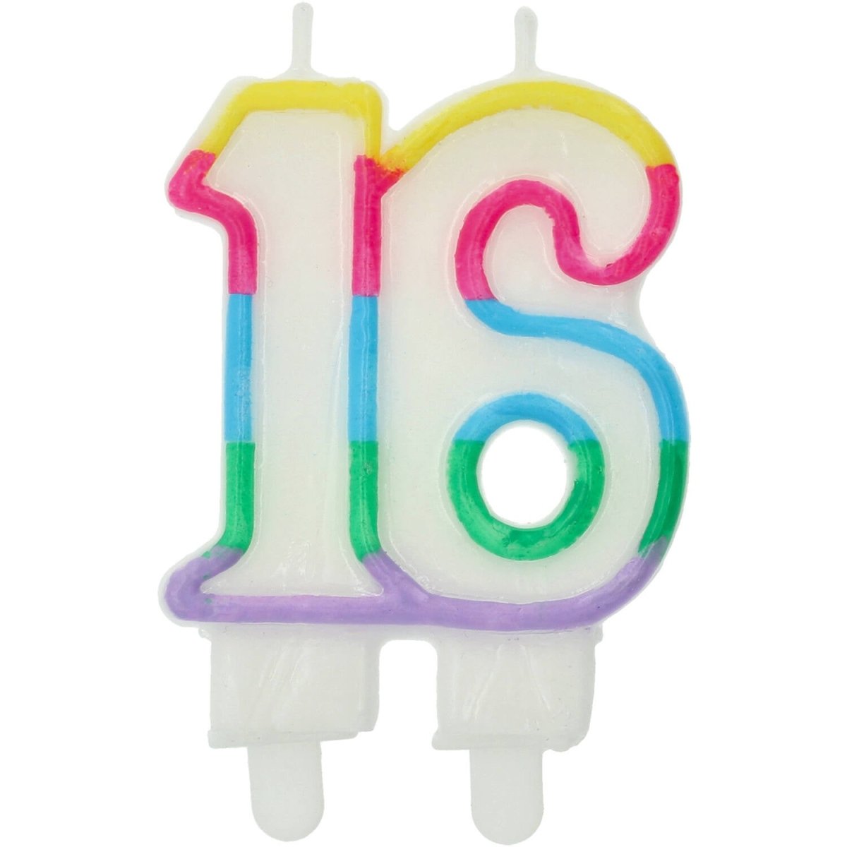 Kaars Colorblock Cijfer 16, 7,5 x 6 cm. Inhoud: 1 kaars. Kleur: Meerkleurig. Bijvoorbeeld te gebruiken tijdens de volgende feestgelegenheid/feestgelegenheden: Verjaardag. Deze kaars is ongeveer 7,5 x 6 cm groot. Het artikel is gemaakt van wax.