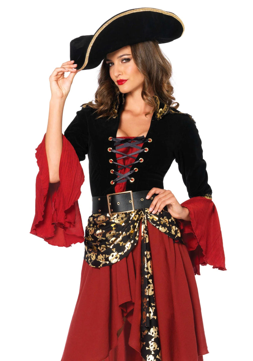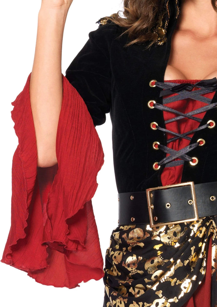 Zet de toon van avontuur en autoriteit met het 2-delige Cruel Seas Captain kostuum van Leg Avenue! Deze set bestaat uit een getailleerde jurk met een extra lange achterkant en een luxe velvet jacket dat aan de jurk is bevestigd. De bijbehorende riem maakt de piratenlook compleet, zodat jij de mooiste en meest gedurfde kapitein bent op elk feest of evenement! 🏴☠️✨