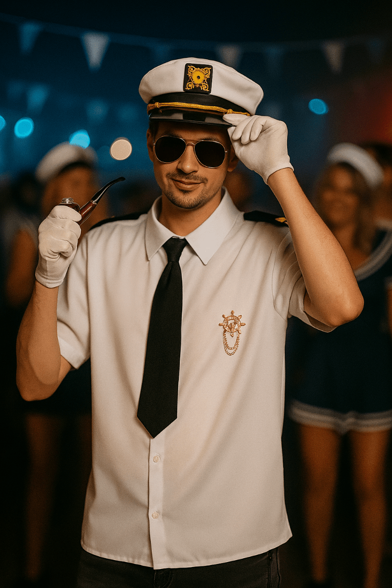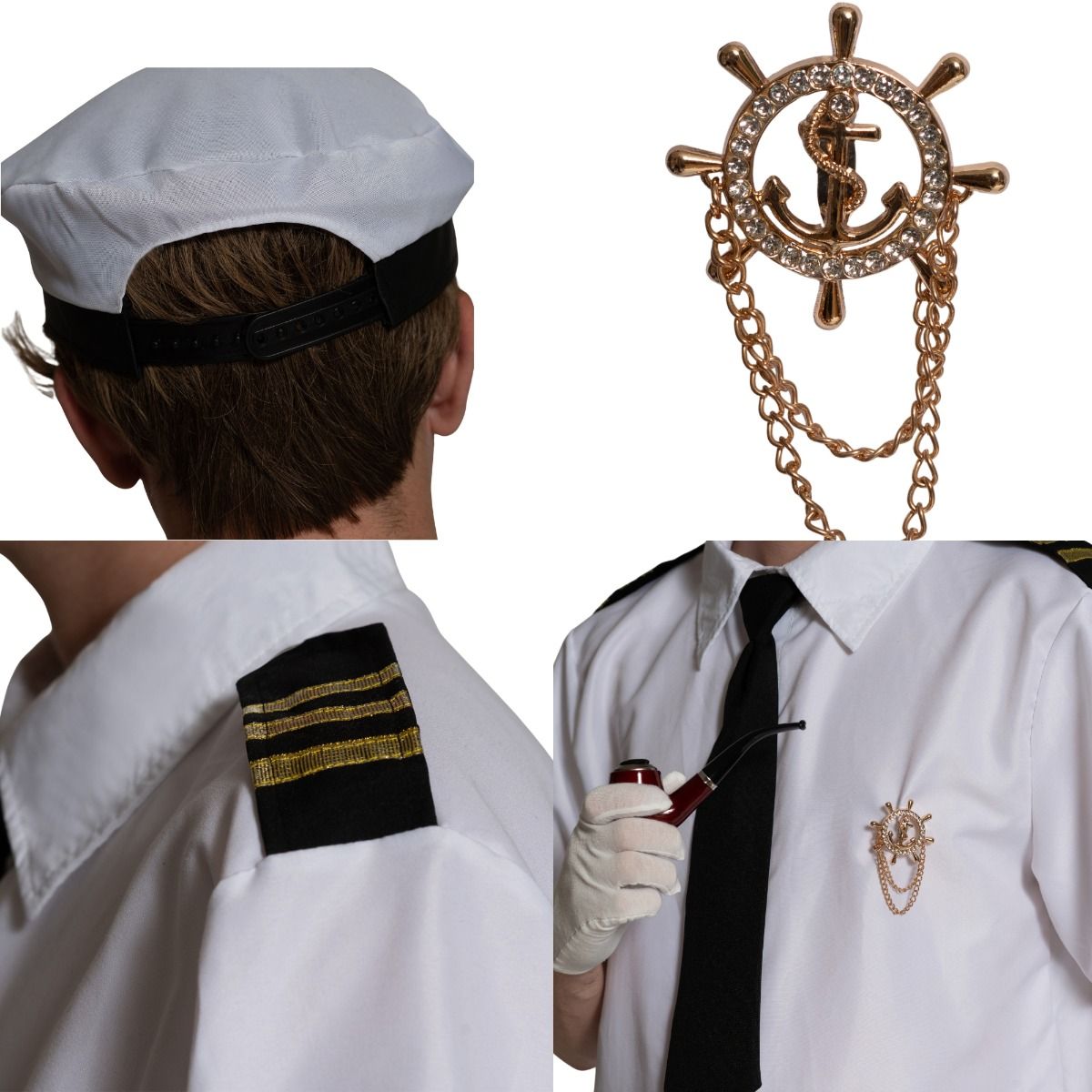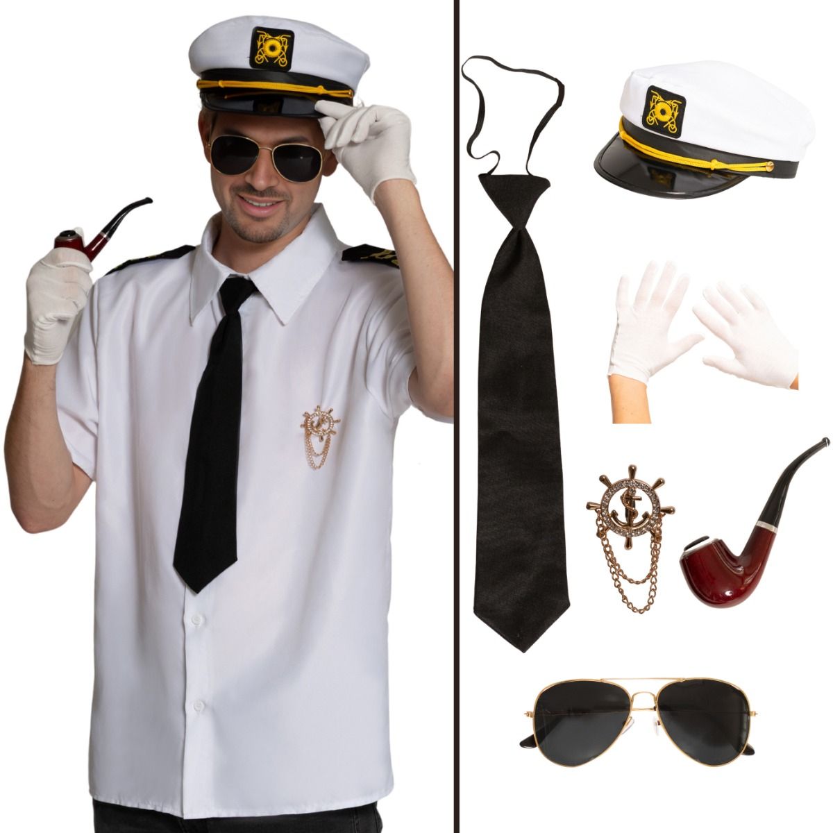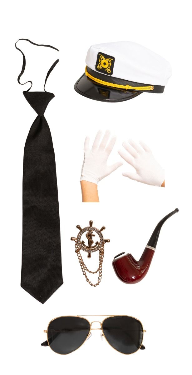 Alles aan boord voor een geslaagde look! Met deze complete Kapitein Set stap je zo in de rol van stoere kapitein of charmante scheepscommandant. Ideaal voor themafeesten, carnaval of een verkleedpartij.