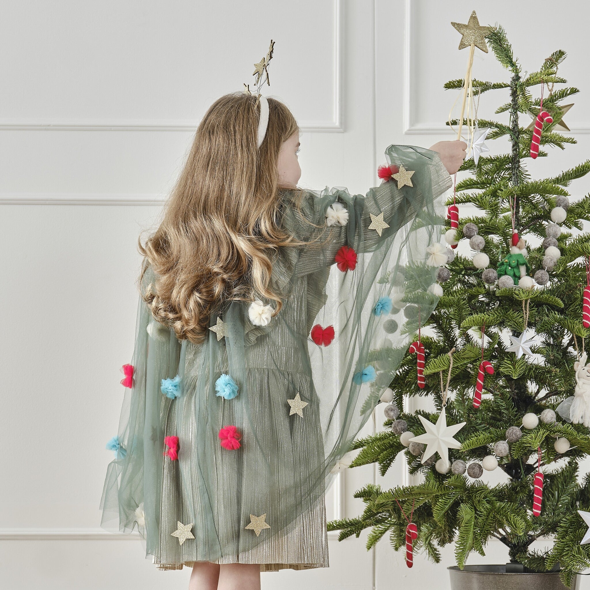 Deze prachtige cape is gemaakt van bosgroene tule met rode, blauwe en crèmekleurige pomponversieringen van tule en gouden glittersterren.