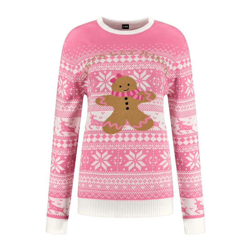 Met deze Pink Gingerbread kersttrui voor dames voeg je direct een vrolijke en zoete kerstsfeer toe aan je outfit. De trui heeft een speels ontwerp met schattige gingerbread-figuurtjes op een zachte roze achtergrond, waardoor hij opvalt tussen alle traditionele kerstkleuren. Perfect voor wie houdt van een frisse, moderne en feestelijke uitstraling.