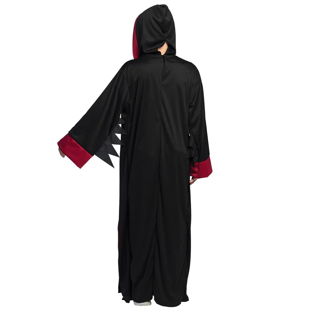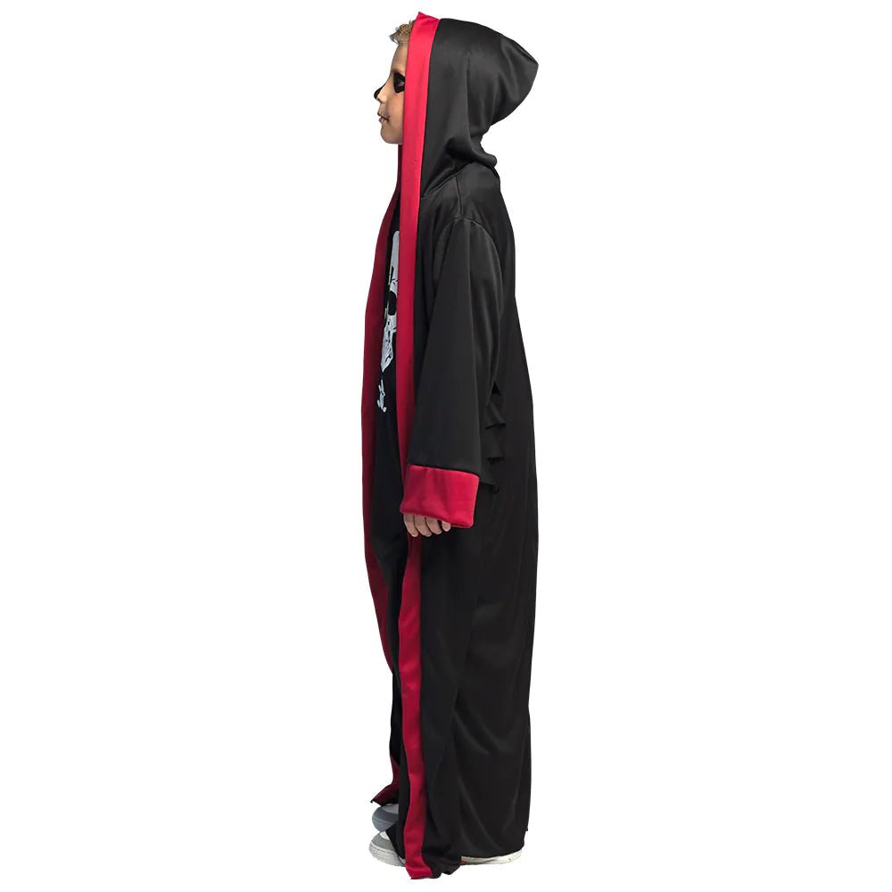 Een stoer horror kostuum voor jongens van 4-6 jaar oud. Het kinderkostuum bestaat uit een zwart gewaad met doodskop en een met zwarte cape met capuchon. Leuke outfit voor kinderen om verkleed te gaan als skelet of dungeon master tijdens Halloween.
