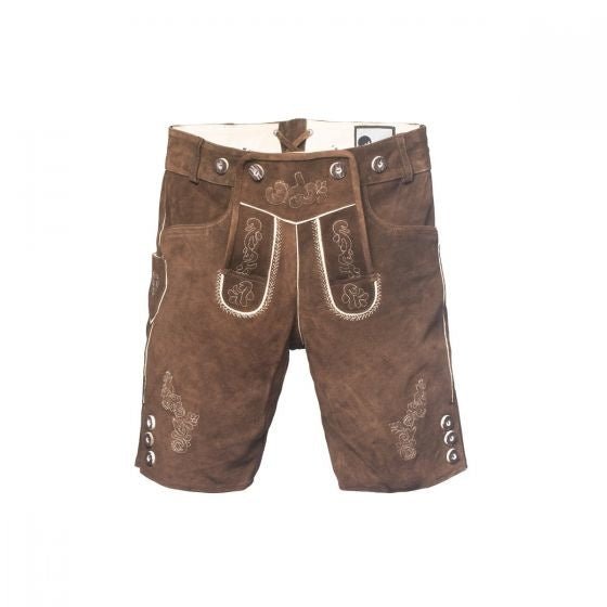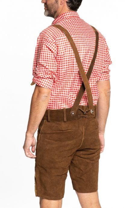 Ga volledig in traditionele stijl naar het Oktoberfest met deze klassieke lederhose met bretels. Het korte model geeft een authentieke uitstraling en biedt tegelijkertijd veel draagcomfort. De warme bruine kleur en het robuuste leer maken deze lederhose tot een duurzame en stijlvolle keuze voor feestelijke gelegenheden.