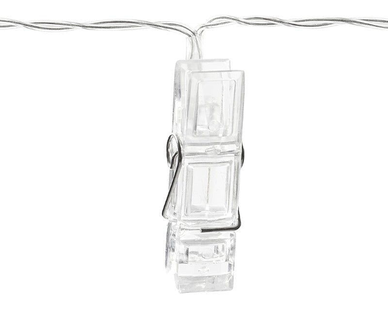 LED fotoclips lampjes, helder op helder draad, lengte draad met lampjes ca. 1,4 m, 10 knijpertjes, warm gele kleur van het licht. Geschikt voor zowel binnen- als buitengebruik. Werkt op batterijen. Lampjes kunnen niet worden aangesloten op lichtsets.