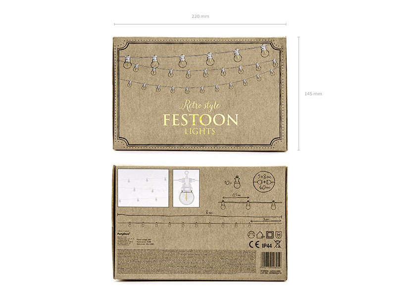 Festoon LED lampjes Retro op een witte draad met 10 heldere lampjes, warm gele kleur van het licht, lengte van de draad ca. 5 m, lengte van de extra draad ca. 3 m. Lampjes kunnen met maximaal 5 sets aan elkaar gekoppeld worden. Geschikt voor zowel binnen- als buitengebruik. Bevatten een EU stekker.