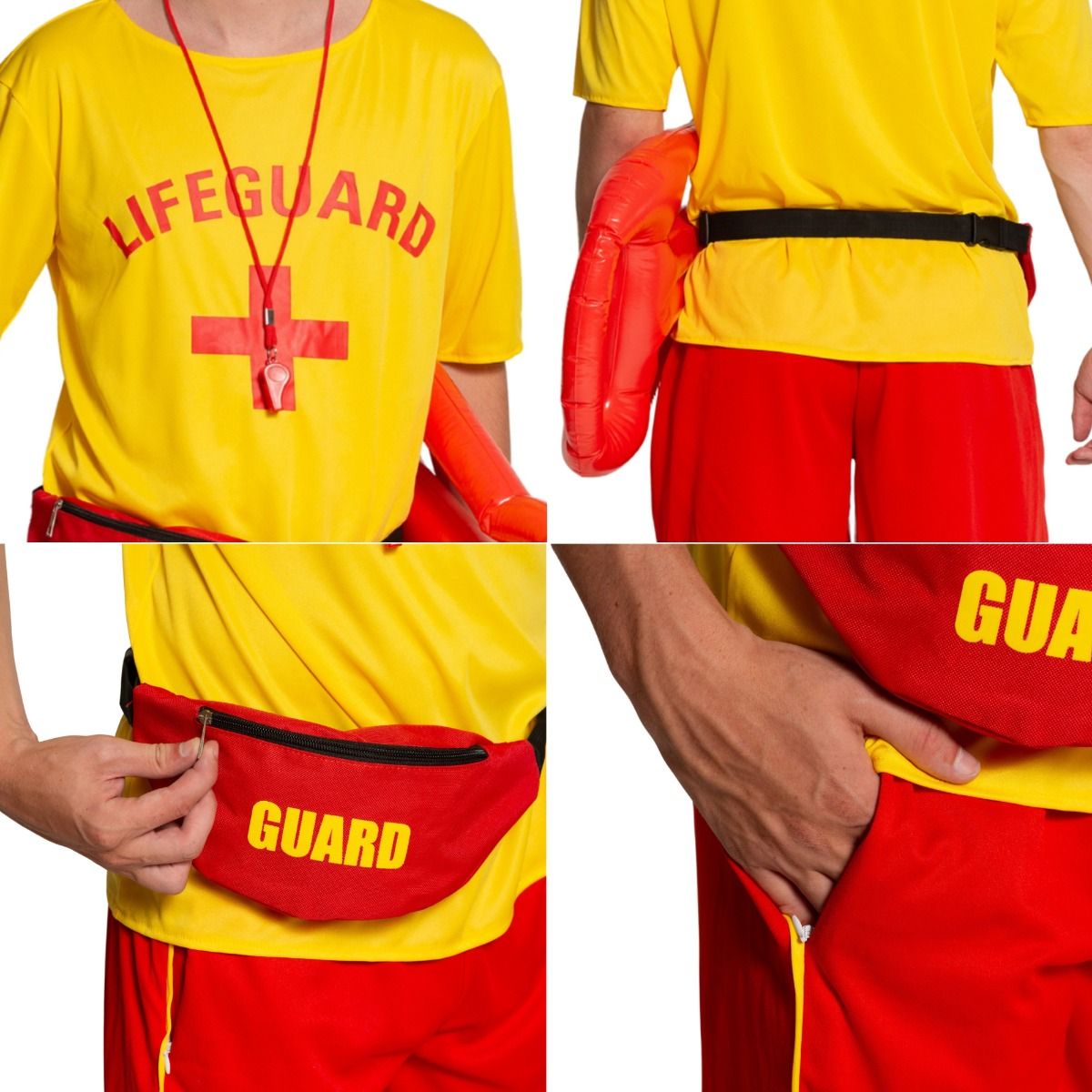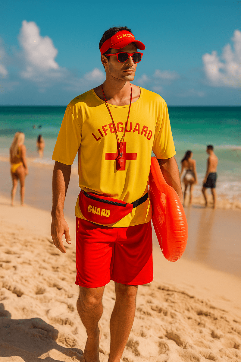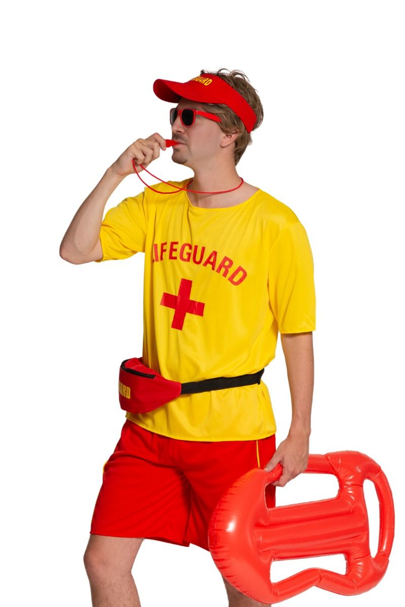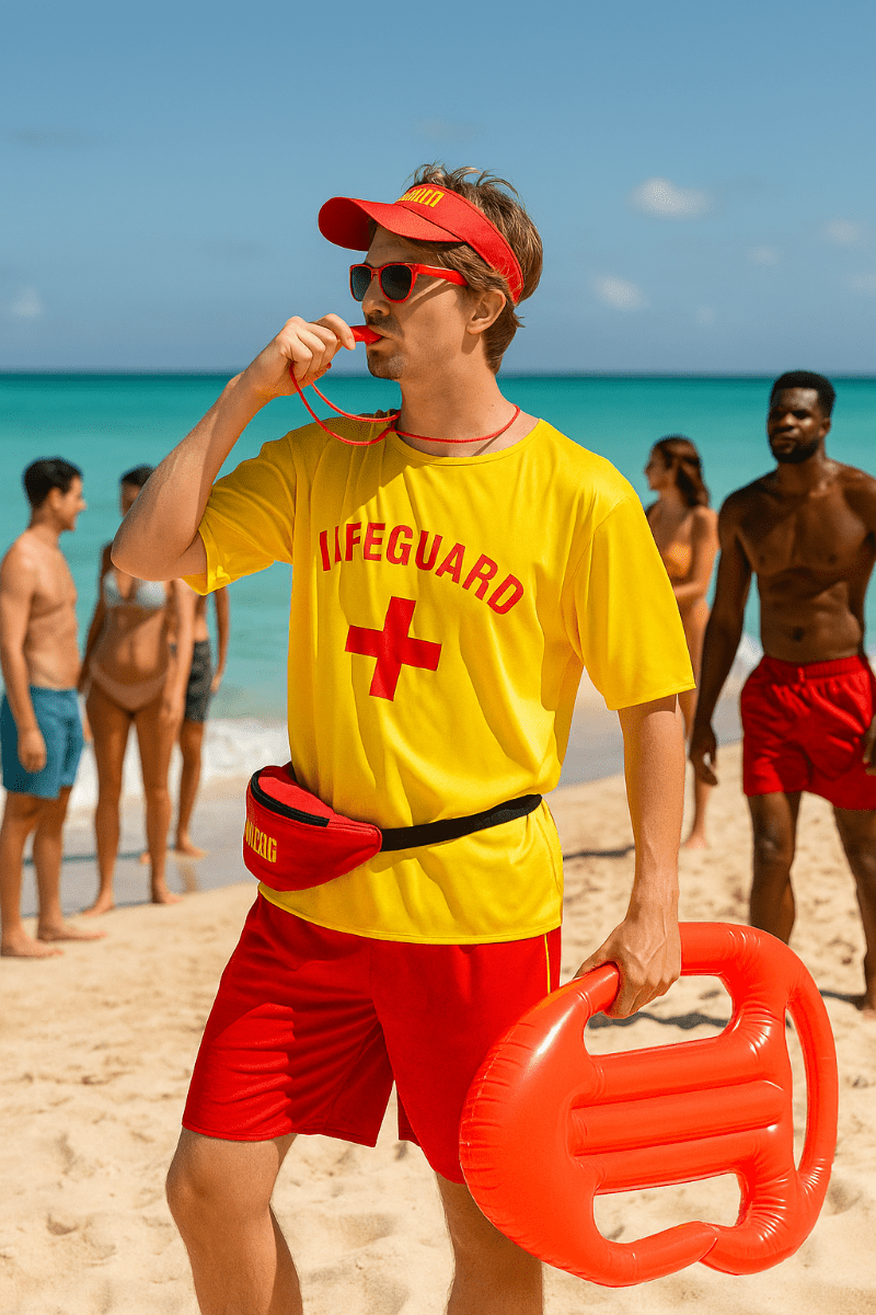 Red de dag in stijl met deze complete strandwacht-outfit voor heren! Perfect voor carnaval, themafeesten, strandparty’s of een zomers verkleedfestijn.