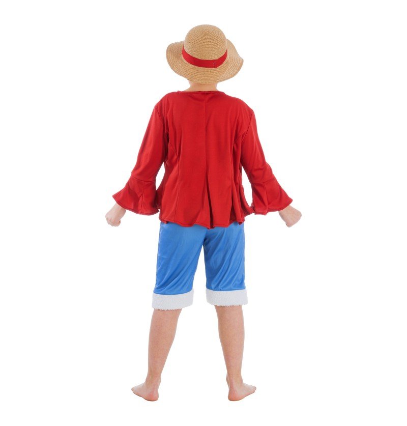 Het rode topje met lange mouwen wordt open gedragen, net als Luffy. De vier gouden knoppen hebben geen functie. De mouwen van het shirt lopen licht uit en hebben een trompetvorm. De gele riem zorgt voor een mooi kleurcontrast en wordt om de taille geknoopt. De lichtblauwe broek doet denken aan jeans en valt tot ongeveer de knieën. De korte bermuda's zijn aan de onderkant licht opgerold en hebben een witte bies. En wat zou Luffy zijn zonder zijn geliefde strohoed? Deze is uiteraard bij de levering inbegrepen en is voorzien van de rode band zoals het origineel.