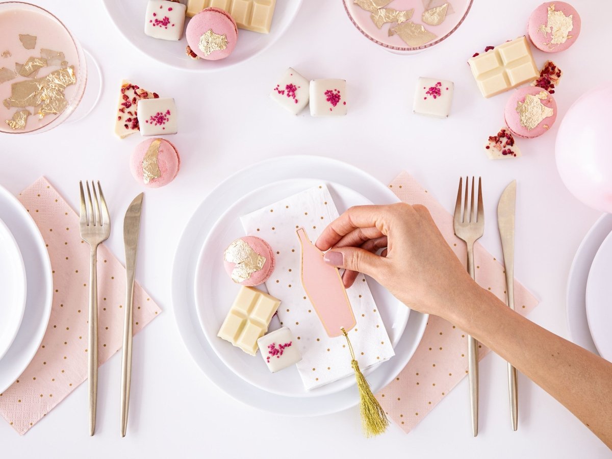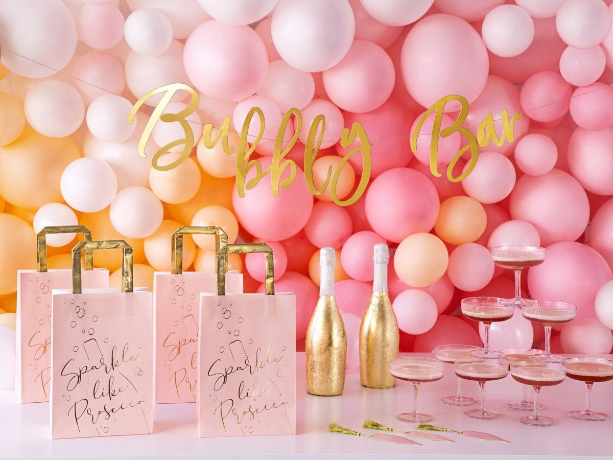 Inhoud: Plaats kaarten van papier in roze kleur met goud metallic print en gouden leeswijzer van de string, de grootte van de fles ca. 3,5 x 10 cm, de grootte van de fles met kwastje ong. 3,5 x 16 cm. (1 PKT / 6 st.)