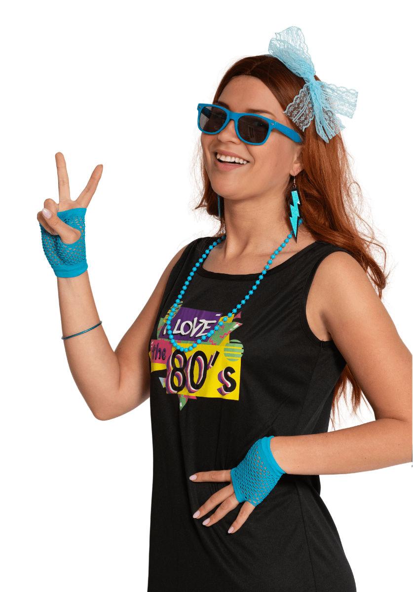 Ga helemaal terug naar de jaren 80 met deze opvallende blauwe accessoires set. Perfect om elke outfit om te toveren tot een echte eighties-look voor feestjes, Carnaval of thema-avonden.