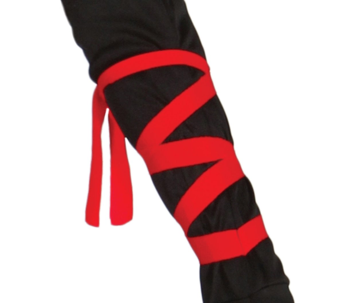 Inhoud: ninja jumpsuit met capuchon en lint, masker, mouwen met linten en riem