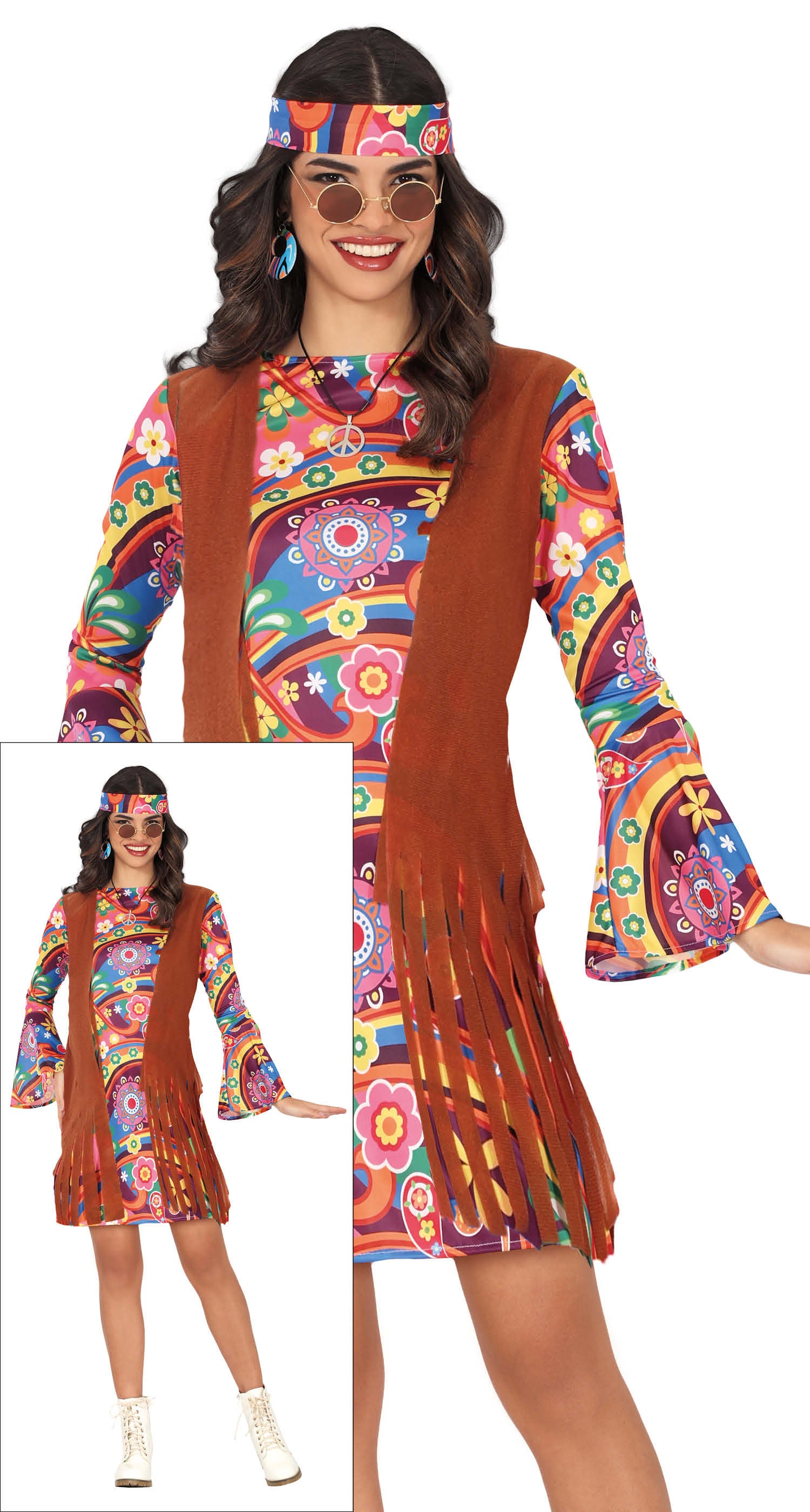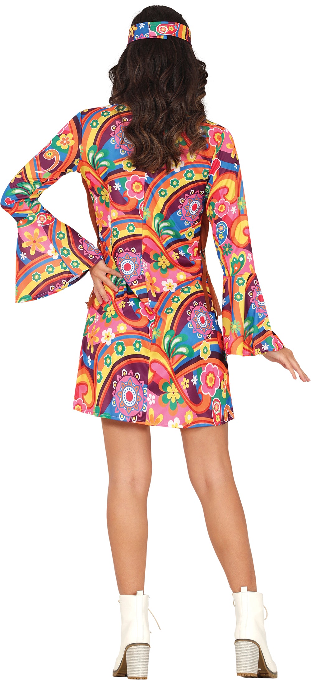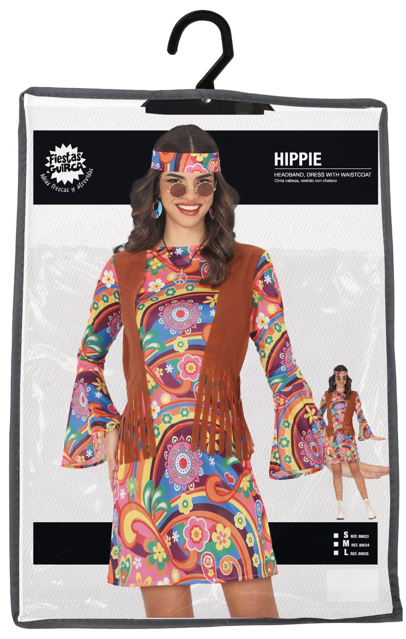 Dit hippie kostuum bestaat uit een kleurrijke jurk en een bijpassende hoofdband. Gemaakt van comfortabel polyester, biedt het kostuum een authentieke en feestelijke uitstraling voor themafeesten, carnaval of verkleedpartijen.