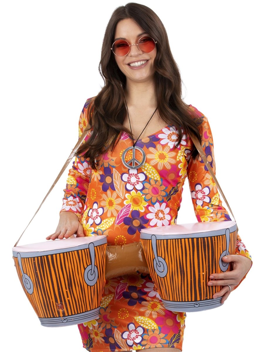 Breng de flowerpower-vibe tot leven met deze opblaasbare hippie bongo drums! Met hun vrolijke uitstraling zijn ze perfect als accessoire voor jaren 60/70 themafeesten, carnaval, festivals of foute party’s. Dankzij het lichte, opblaasbare ontwerp en de meegeleverde schouderband draag je ze eenvoudig overal mee naartoe.