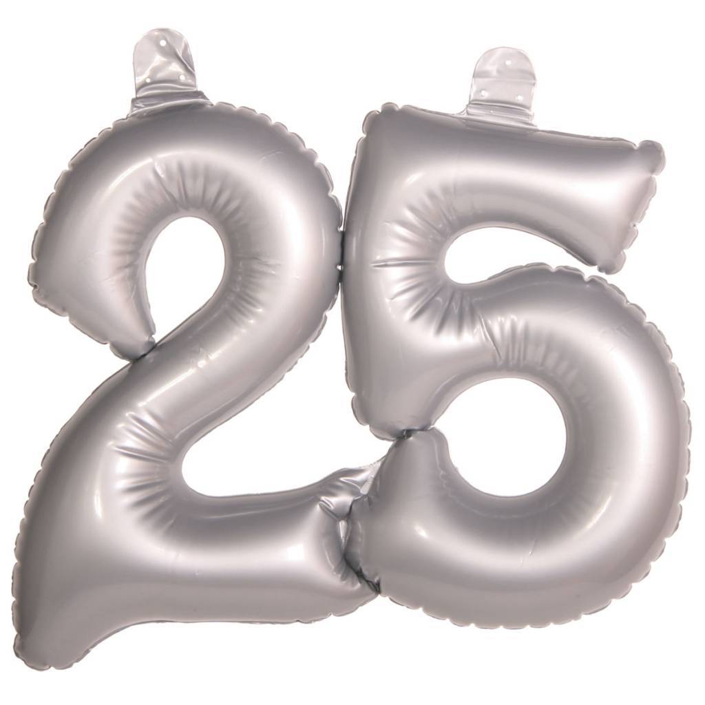 Zilver opblaascijfer in de vorm van het cijfer 25. Ideaal voor een 25 jarig jubileum feest of een 25ste verjaardag. Inhoud: 1 opblaasbaar cijfer. Het opblaascijfer is eenvoudig op te blazen en je kunt het ergens ophangen of neerzetten. Dit opblaascijfer is 45x 35 cm. Het artikel is gemaakt van plastic.