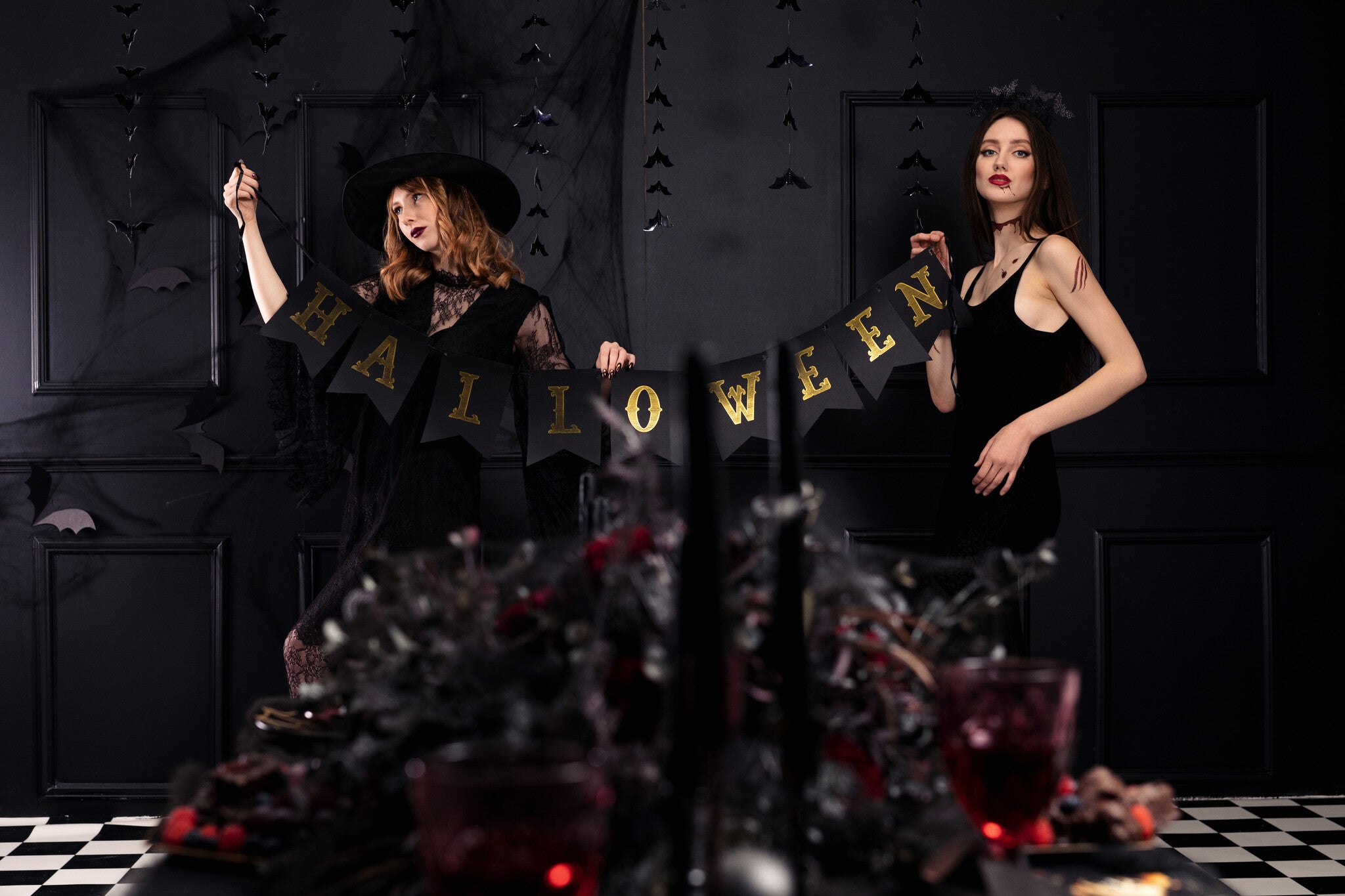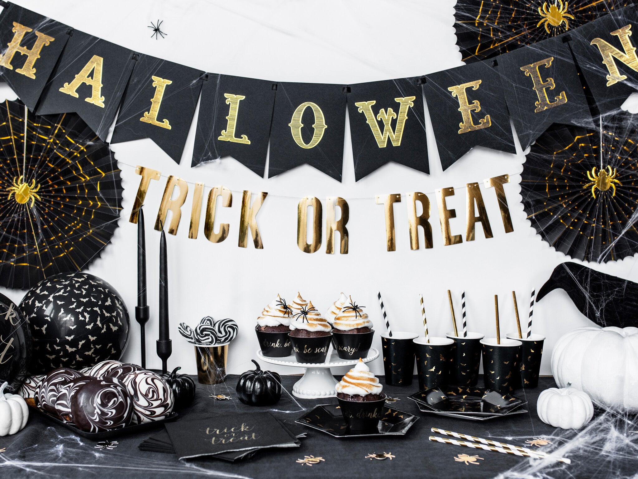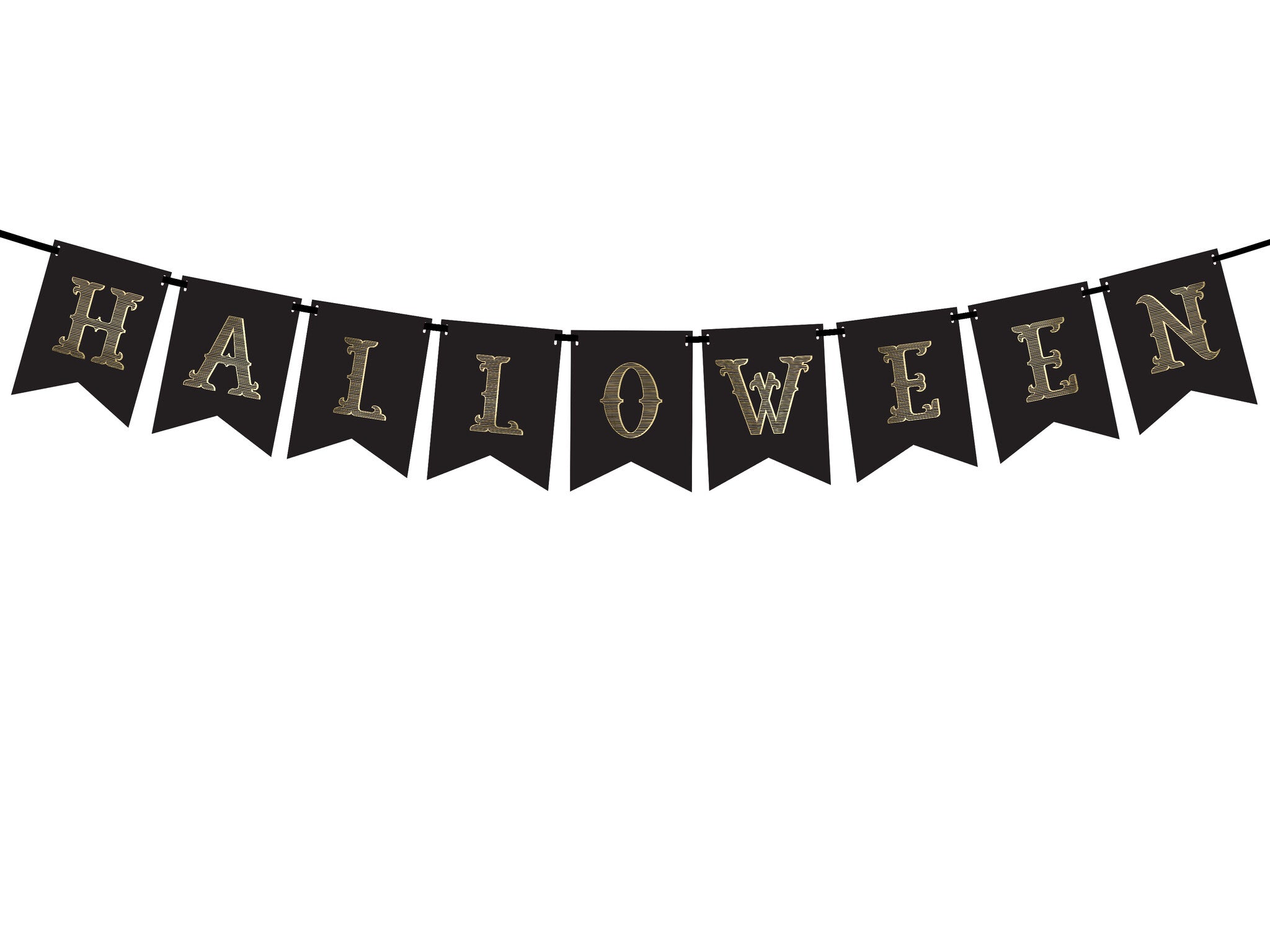 Halloween letterslinger van zwart papier, doe het zelf, set bevat letters en ca. 2,5 m lint, afmetingen na montage: hoogte ca. 20 cm, lengte ca. 175 cm.
