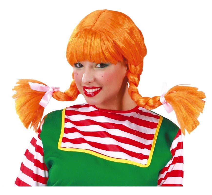 Inhoud: oranje pruik met strikken en buigbare vlechten