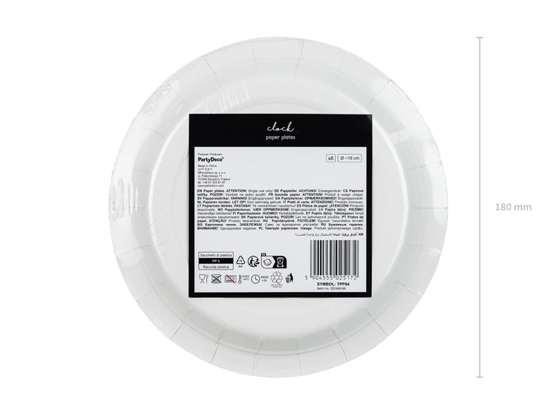Papieren borden Klok in zwarte kleur met goudopdruk, afmeting ca. 18 cm.(1 pkt / 6 stuks) Materiaal: Papier ongestreken met folie en ongelakt - 100%
