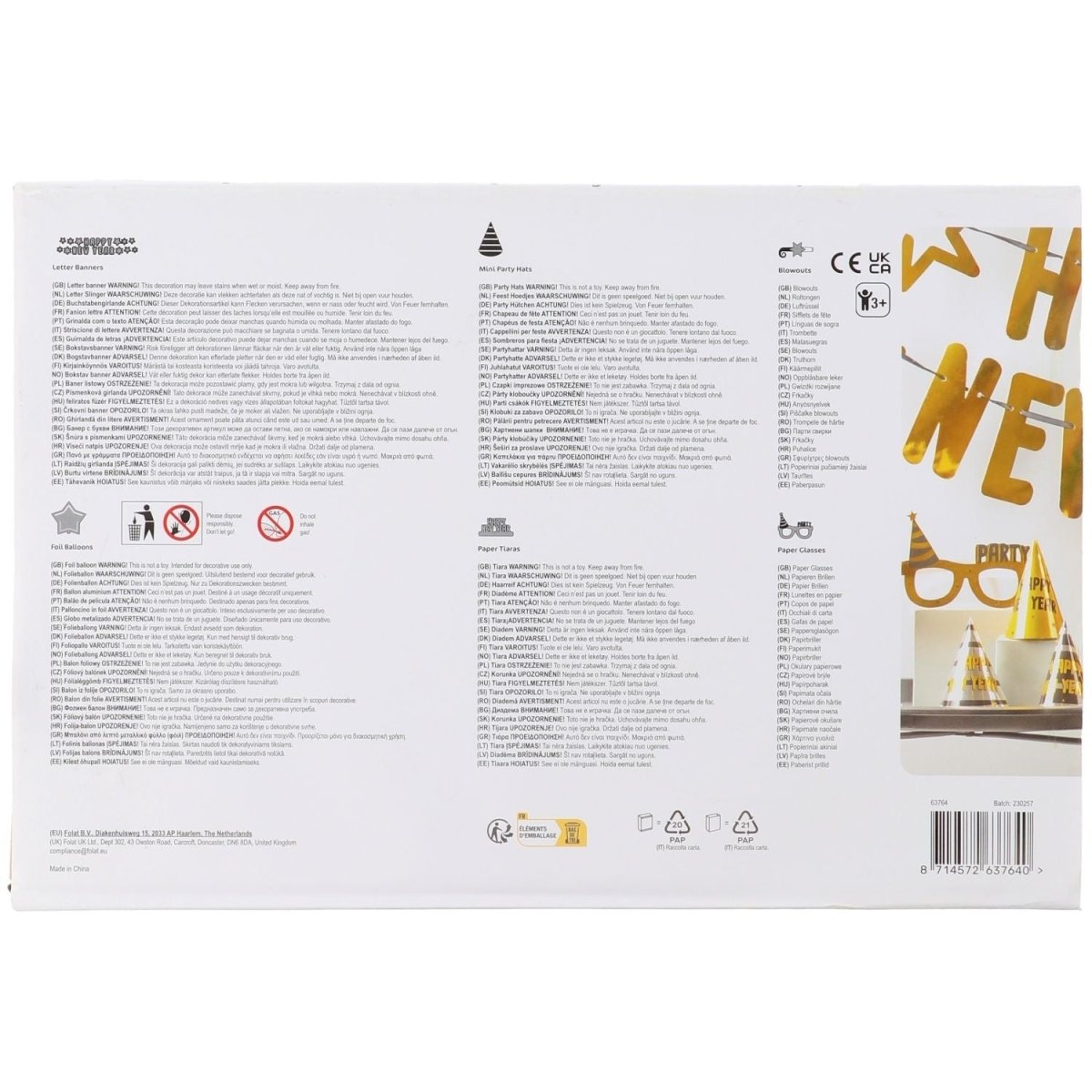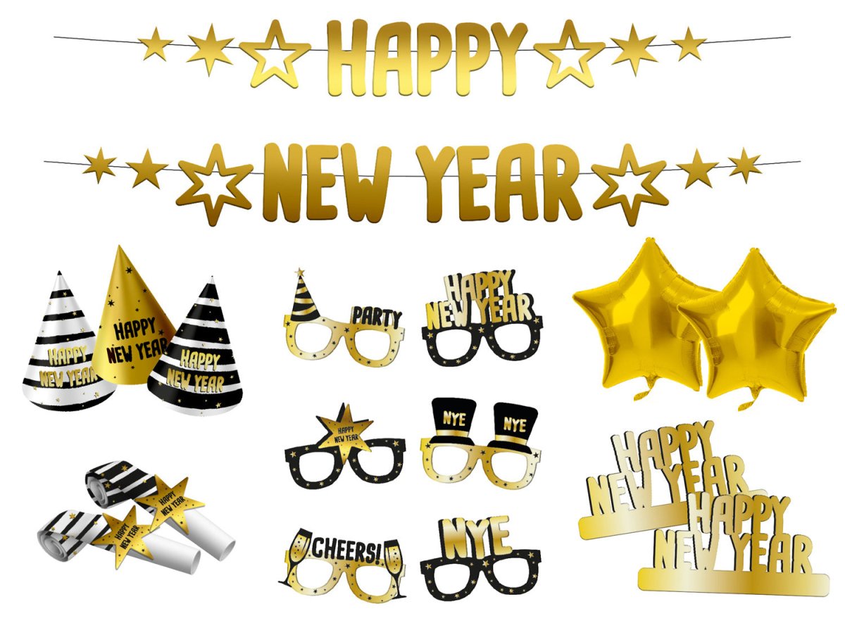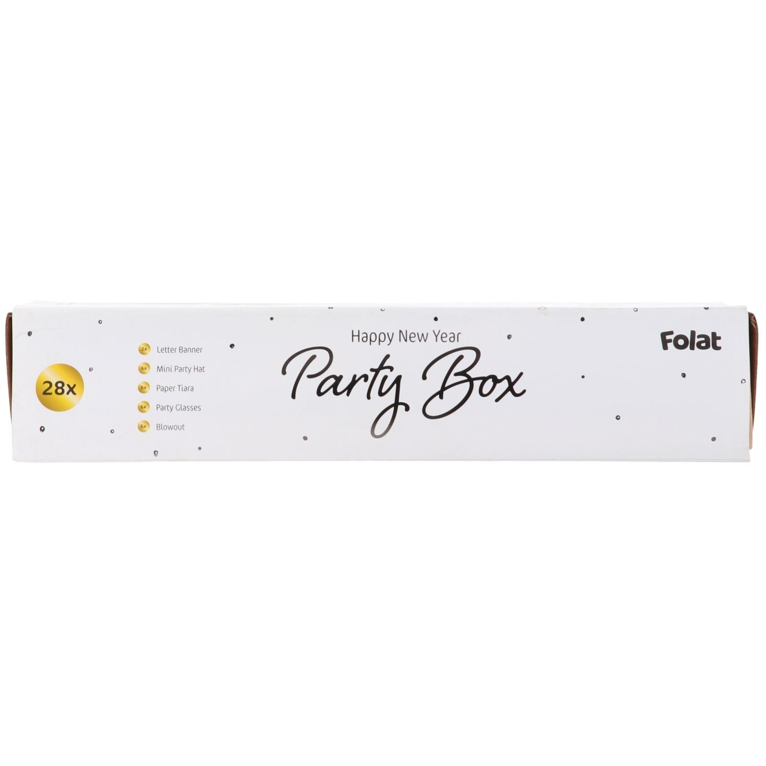 Eén groot Oud en Nieuw Feest! Feestpakket Happy New Year, BlackGold HNY. Inhoud: 1 feestpakket. Bijvoorbeeld te gebruiken tijdens de volgende feestgelegenheid/feestgelegenheden: Oud en Nieuw. Met dit feestpakket is elk Oud en Nieuw feestje direct goed geregeld. Alles in hetzelfde stijlvolle BlackGold HNY thema, compleet met maar liefst 28 feestartikelen: 2 letterslingers, 6 feesthoedjes, 6 roltongen, 6 papieren feestbrillen, 6 tiara's en 2 gouden ster folieballonnen. De doos is gemaakt van papier.