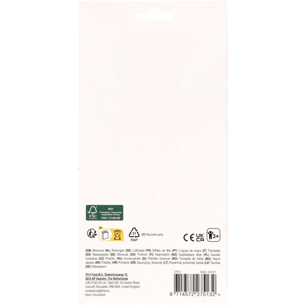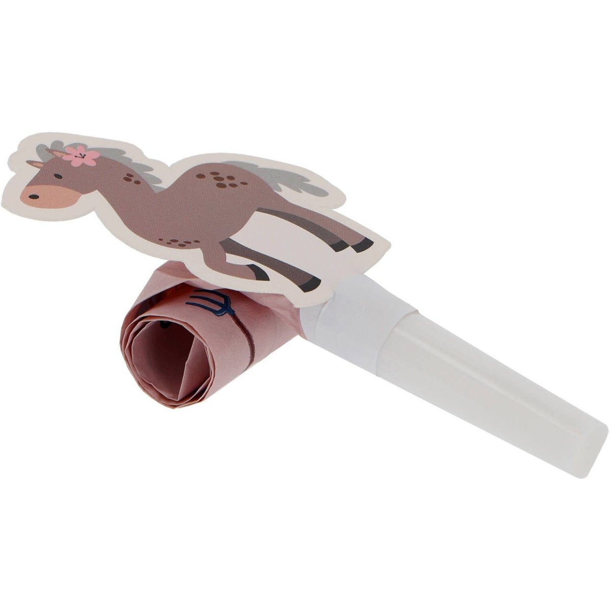 Feestelijke toeters met paardje. Roltongen - Happy Horses - 6 stuks. Inhoud: 6 roltongen. Bijvoorbeeld te gebruiken tijdens de volgende feestgelegenheid/feestgelegenheden: Kinderfeestje, Verjaardag, Themafeest. Deze 6 gezellige roltongen zijn zachtroze en dubbelzijdig bedrukt met vrolijke figuren die passen bij vrolijke paardjes. Ze hebben een kartonnen paardje als extra decoratie. Uitgerold zijn de roltongen ongeveer 28 cm. Het mondstuk is plactic, wit en 5 cm lang. Het rolgedeelte is 4 cm breed en 23 cm lang (uitgerold). Ingerold zijn de roltongen ongeveer 11 cm. Dit artikel is gemaakt van papier.