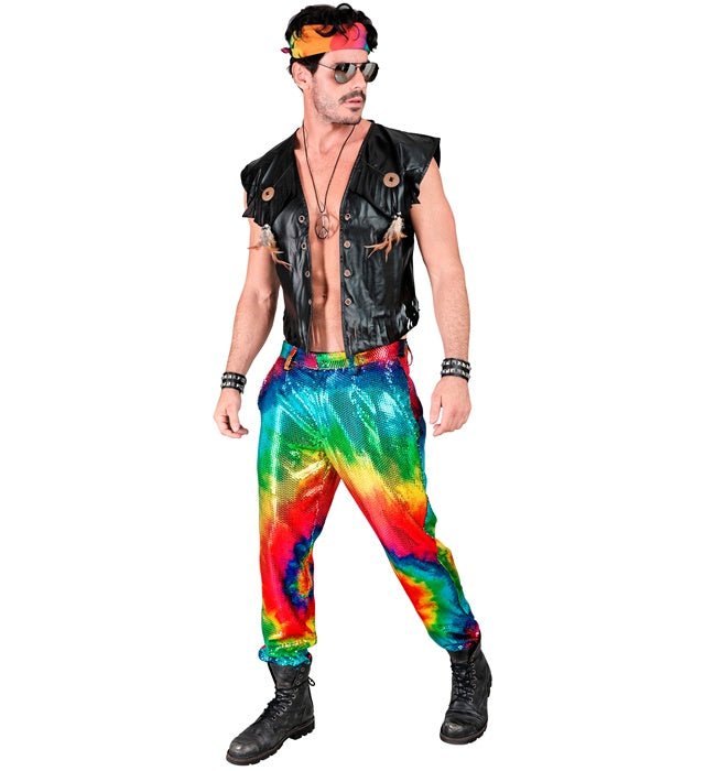 Val op met deze opvallende tie-dye paillettenbroek die kleur en glitter combineert, perfect voor verkleedfeestjes, festivals of thema-evenementen.