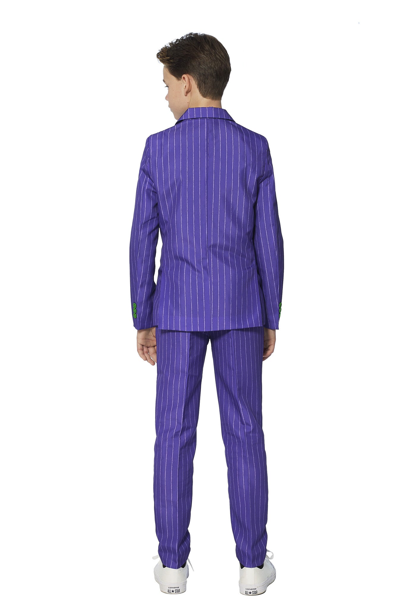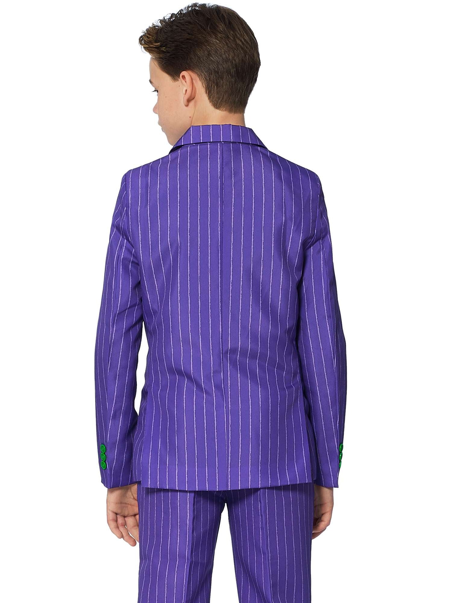Of je kleine jongen The Joker™ nu kent uit een film, een stripboek of een videogame, één ding is zeker: je zult je kleine jongen laten lachen als de schurk met dit officiële The Joker™ pak. Het is geweldig voor vele gelegenheden, zoals verkleedfeestjes en Halloween. De outfit bestaat uit een jasje, een broek en een veilige clip-on stropdas. De broek heeft een verstelbare tailleband voor een comfortabele en stijlvolle pasvorm.