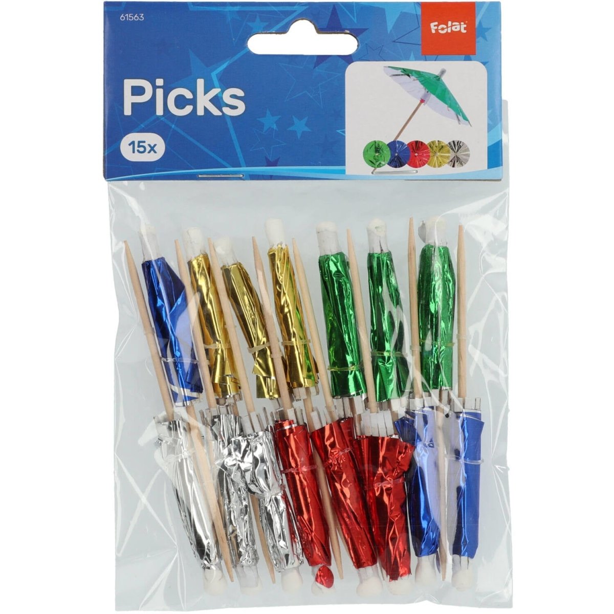 Parasol Prikkers Metallic Kleuren - 15 stuks. Inhoud: 15 prikkers. Kleur: Meerkleurig Metallic. Bijvoorbeeld te gebruiken tijdens de volgende feestgelegenheid/feestgelegenheden: verjaardag, kinderfeestje, themafeest. Deze prikkers zijn 14,5 cm hoog. Het artikel is gemaakt van bamboe.