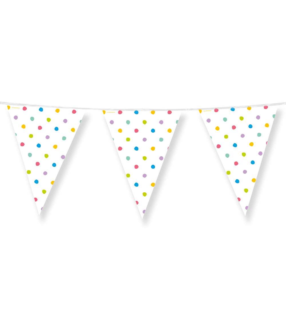 Geef ieder feestje meteen een kleurrijke boost met deze Party flags - Party Dots! De vrolijke stippenprint maakt deze vlaggenlijn een echte blikvanger en perfect voor verjaardagen, kinderfeestjes, summer parties of elke gelegenheid die wel wat extra kleur kan gebruiken.