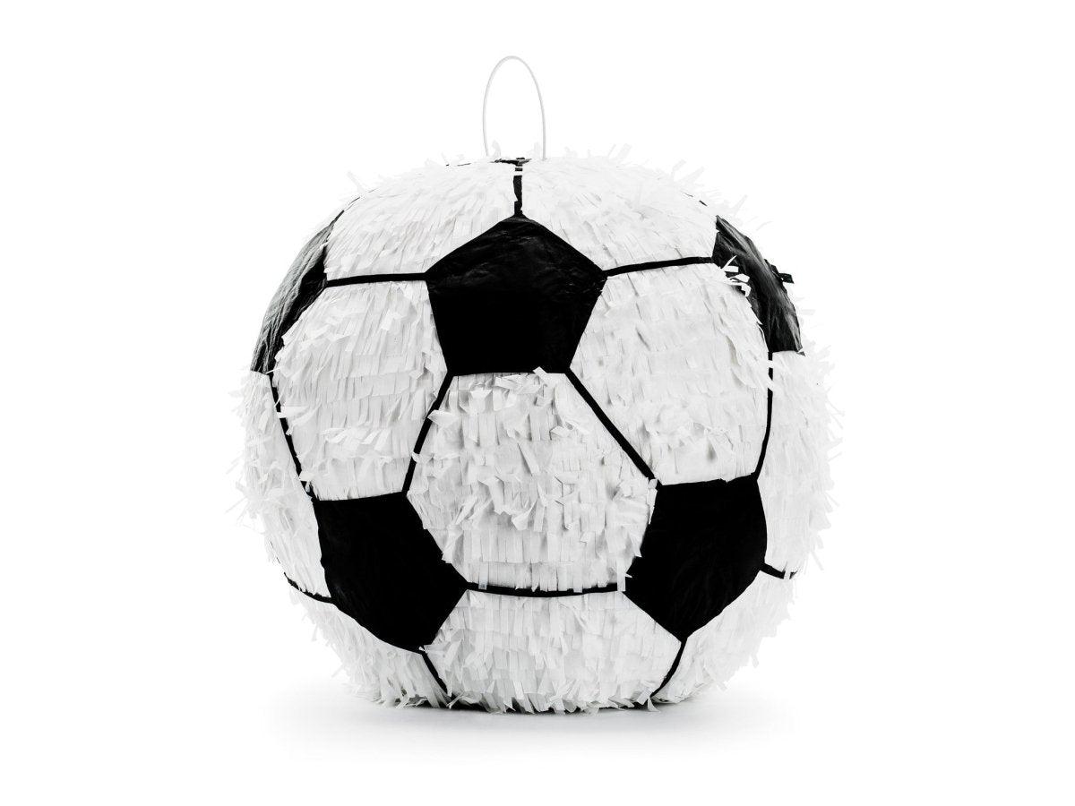 Inhoud: Pinata in de vorm van het voetbal in de kleur wit met zwarte elementen, tot ca. vullen met goodies, grootte. 35 x 35 x 35 cm.