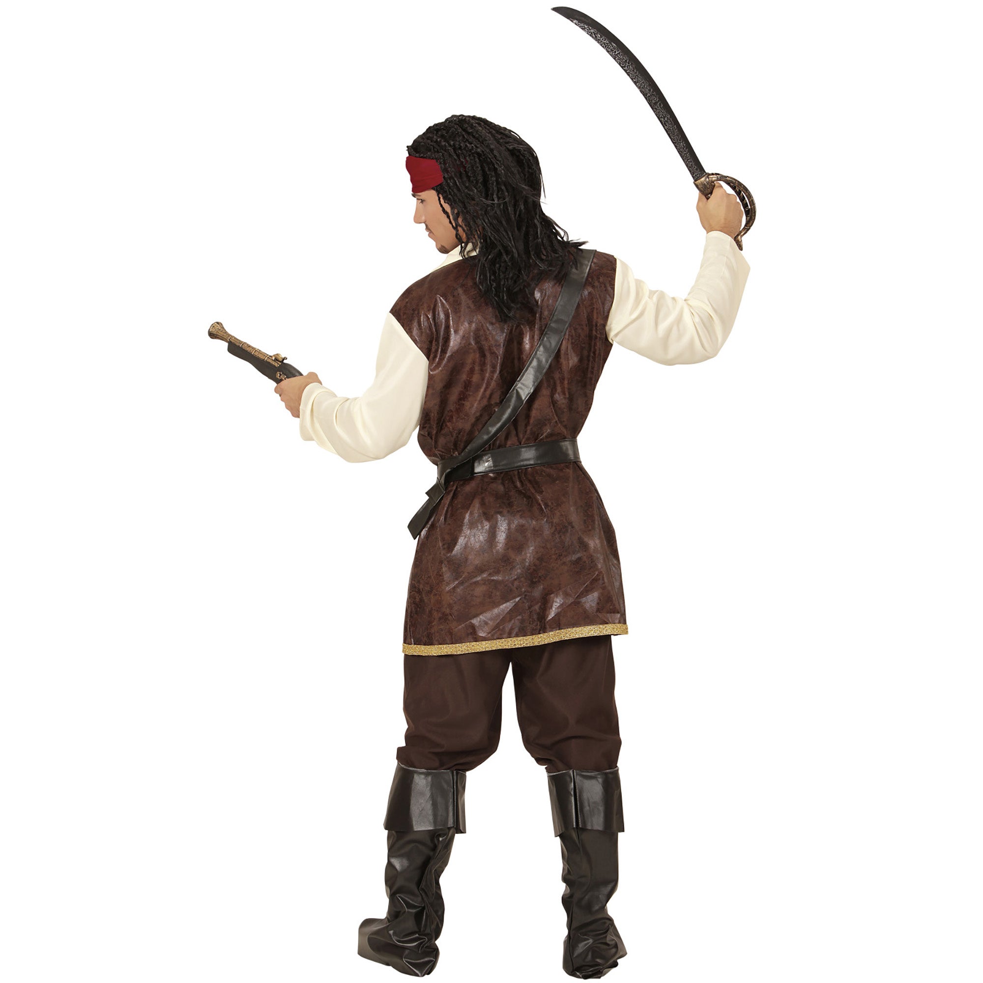 Omschrijving: piratenjas met shirt, broek, riem, zwaardsjerp met gesp, hoofdband, laarsbeschermers