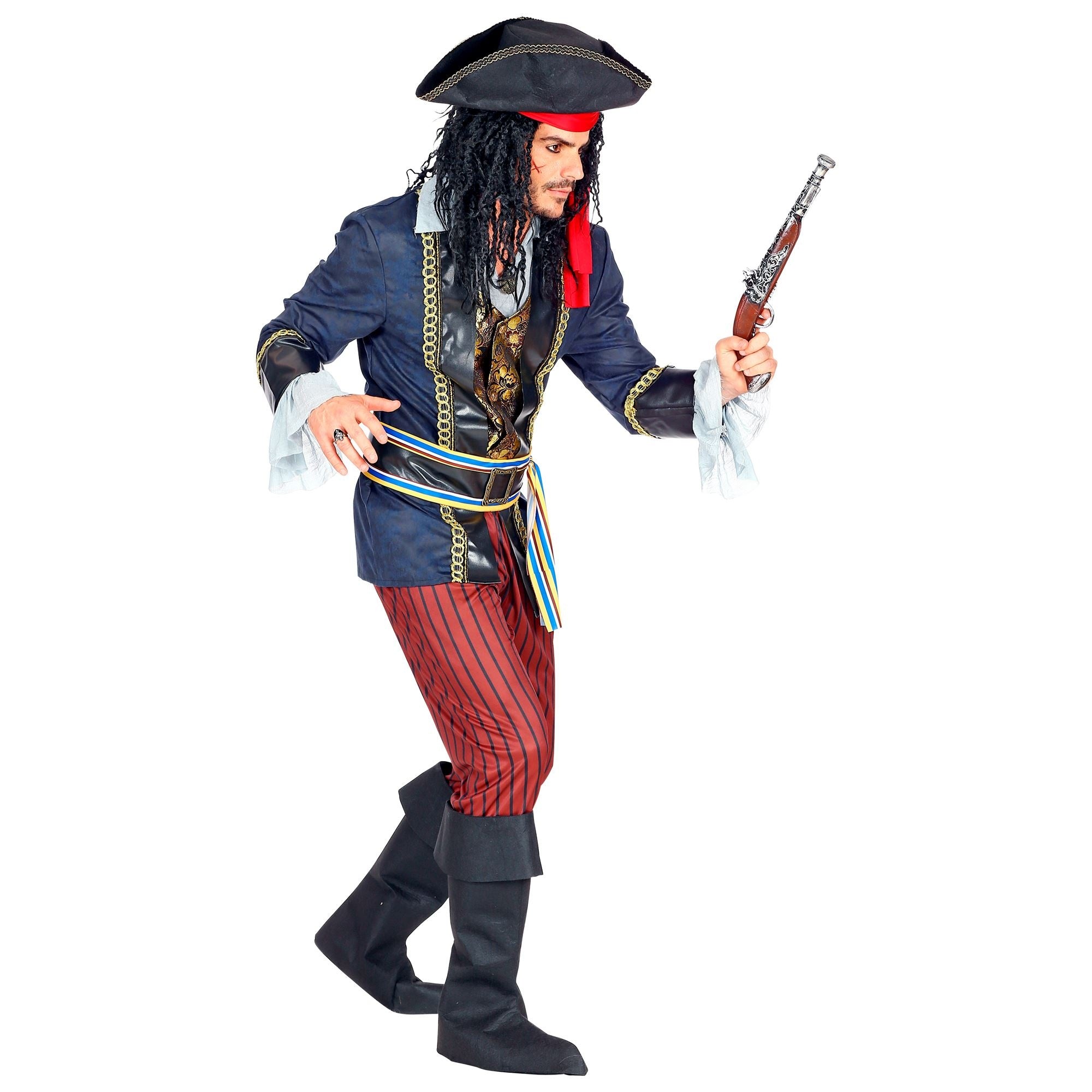 Omschrijving: piratenkapitein jas met vest & shirt, broek, riem met gesp & sjerp, laarsovertrekken, hoed met bandana