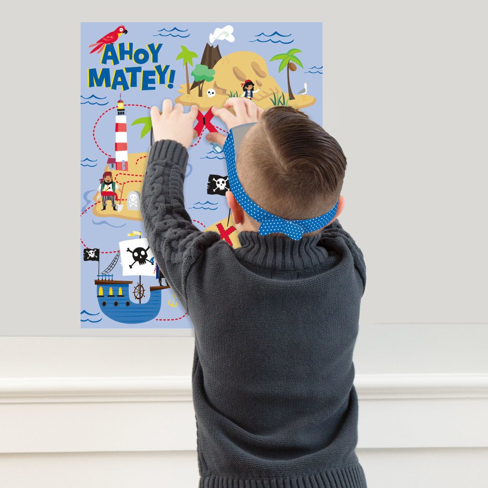 Inhoud: vel voor aan de muur, blinddoek en 24 stickers