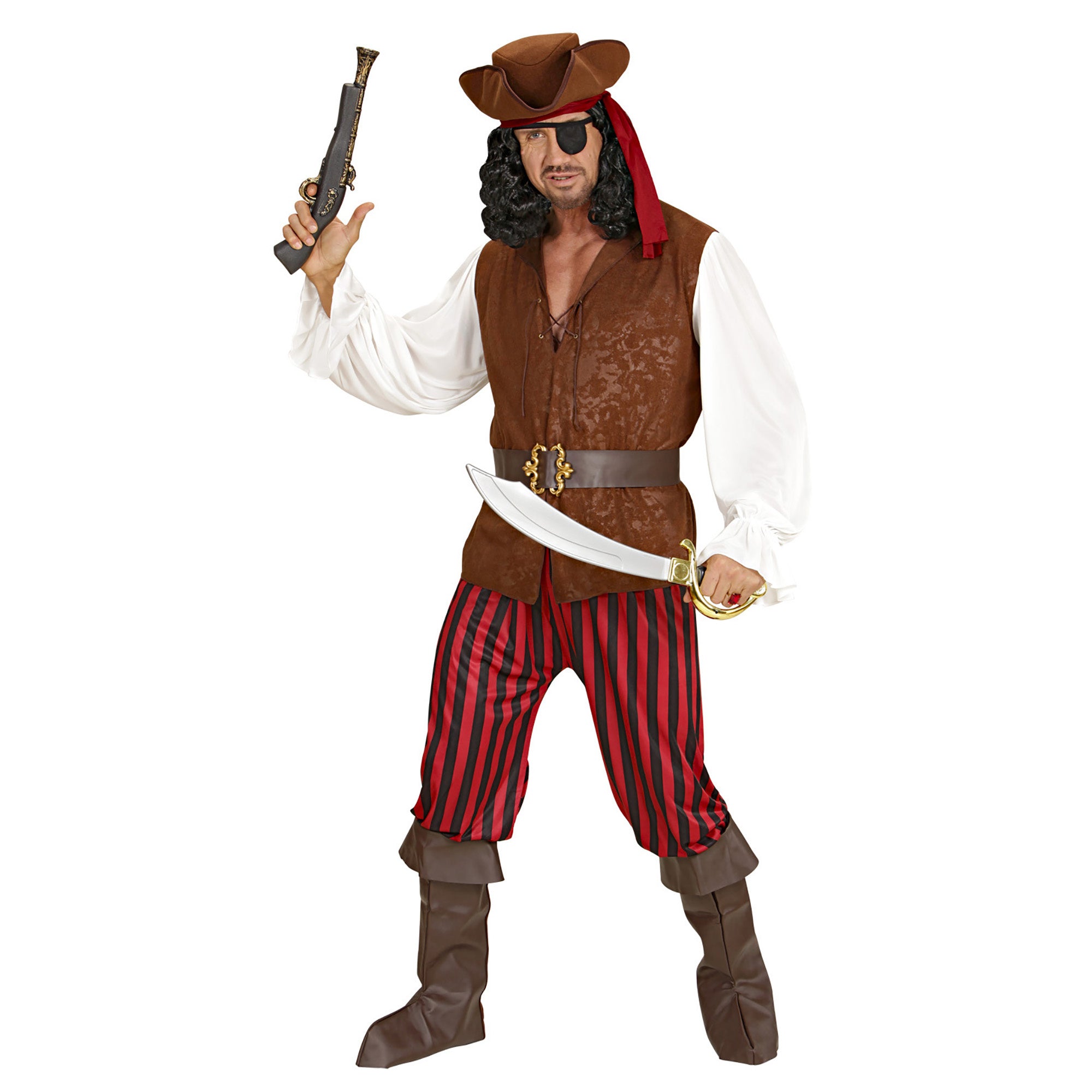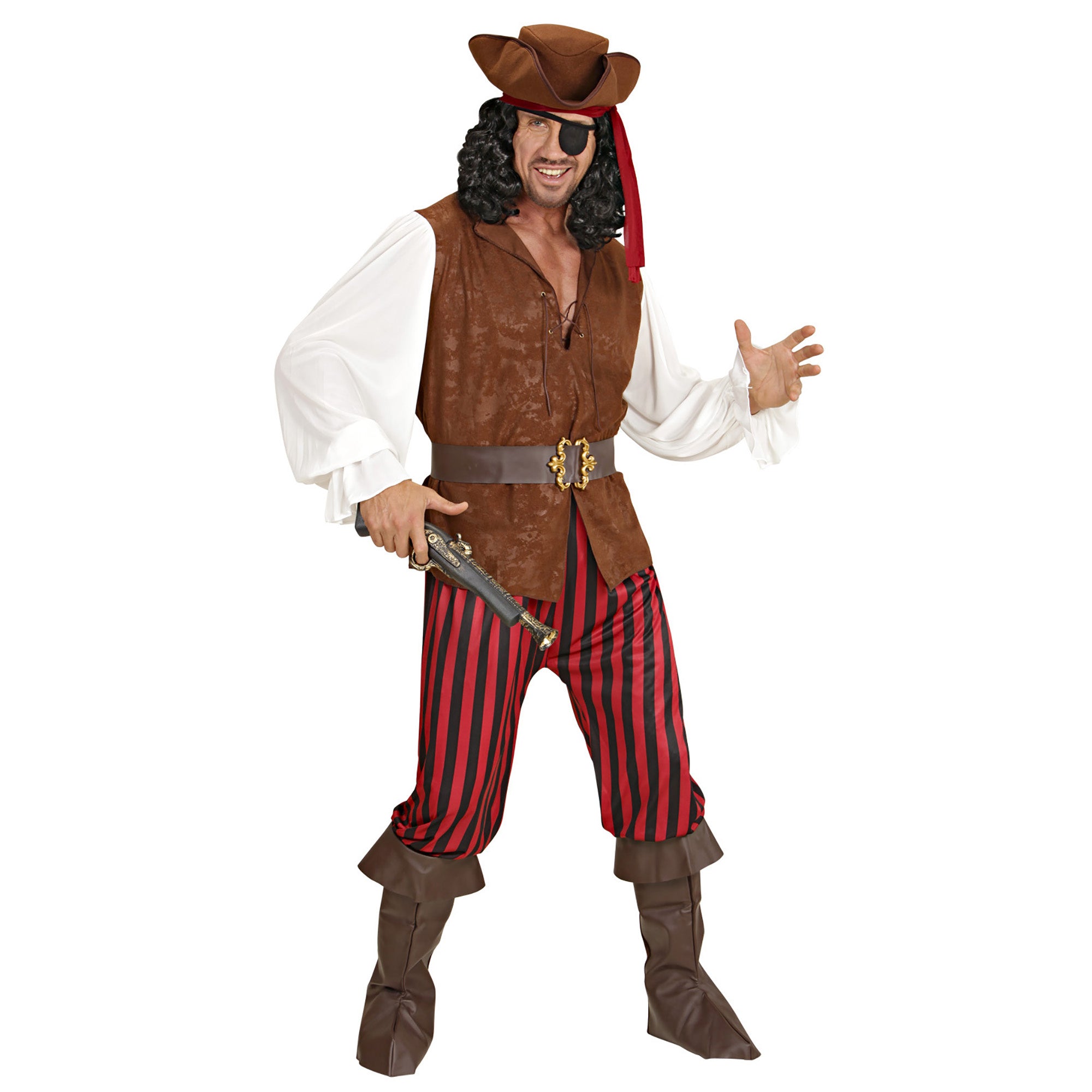 Omschrijving: piratenhemd met vest, broek, riem, laarsbeschermers, hoofdband, hoed, ooglapje