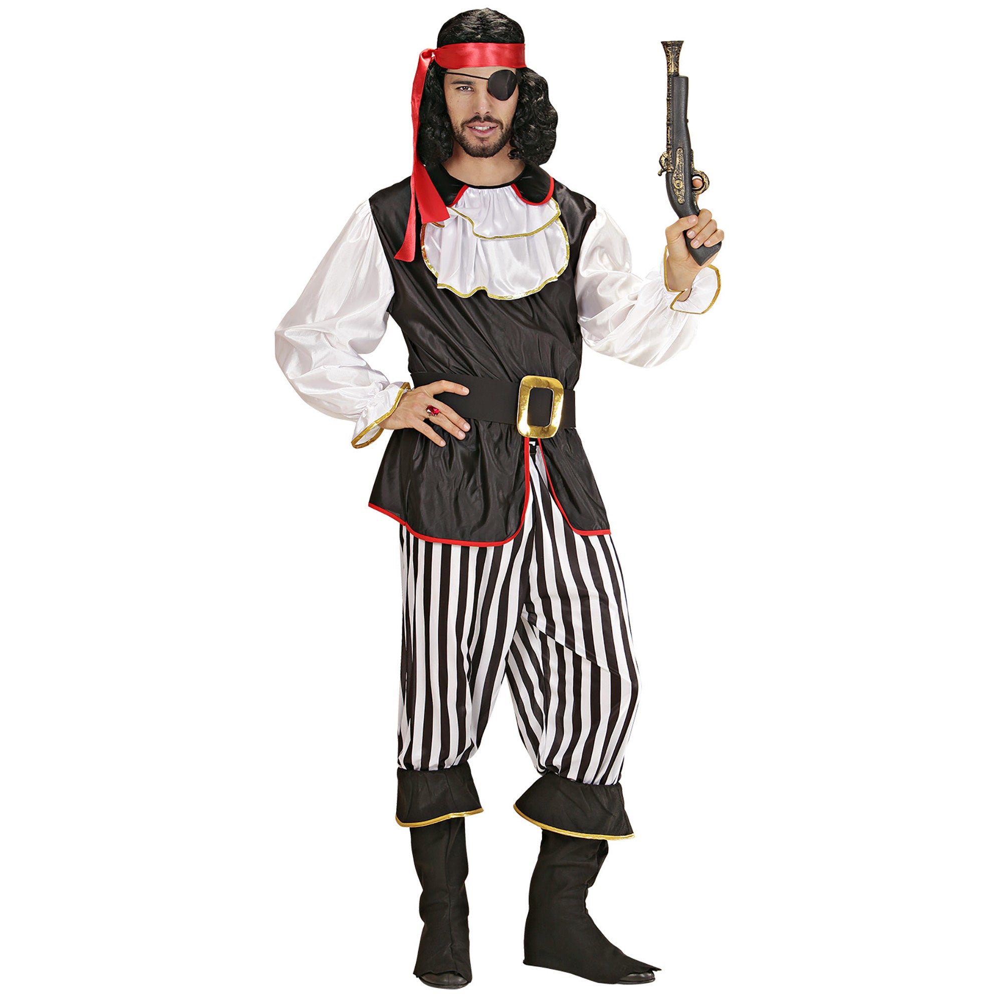 Omschrijving: piratenjas met jabot, broek, riem, laarsbeschermers, hoofdband