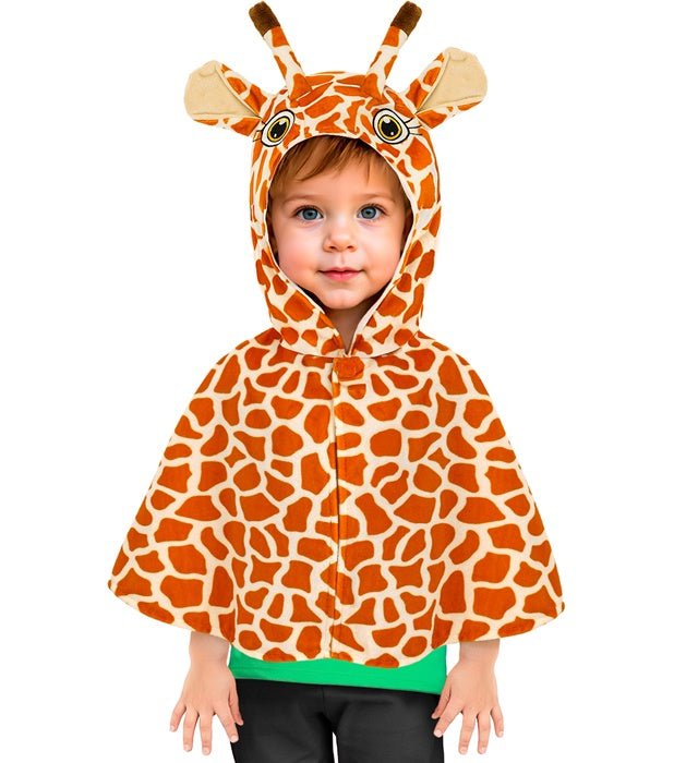 Deze zachte pluche poncho met muts in girafstijl is een vrolijke en comfortabele outfit, perfect voor verkleed- en speelmomenten.