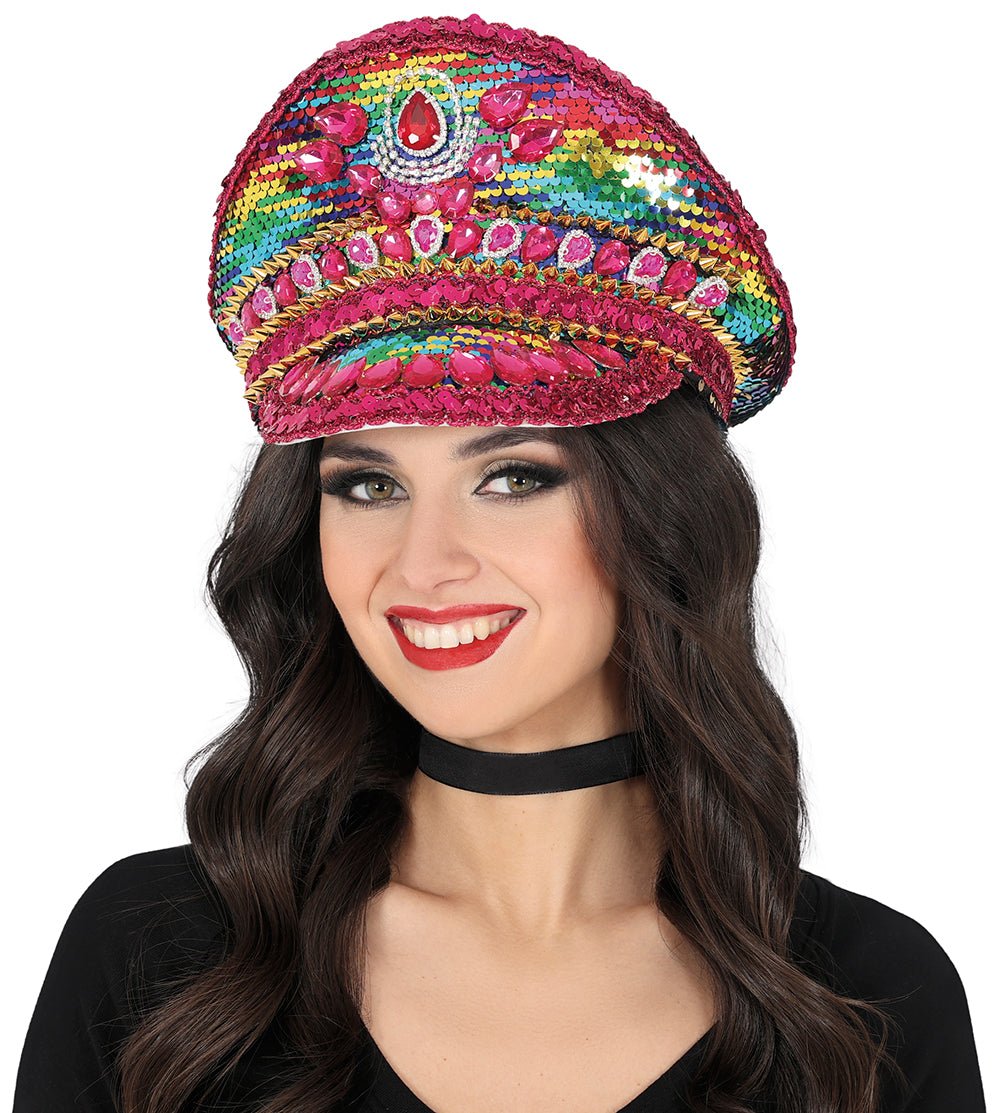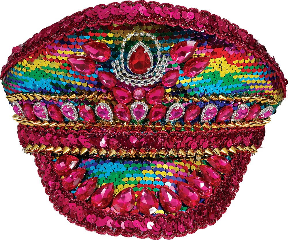 Laat je opvallen met deze feestelijke politie pet in regenboogkleuren, afgewerkt met fonkelende steentjes en een roze band. Een perfecte combinatie van stoer en speels, ideaal voor feesten en festivals.