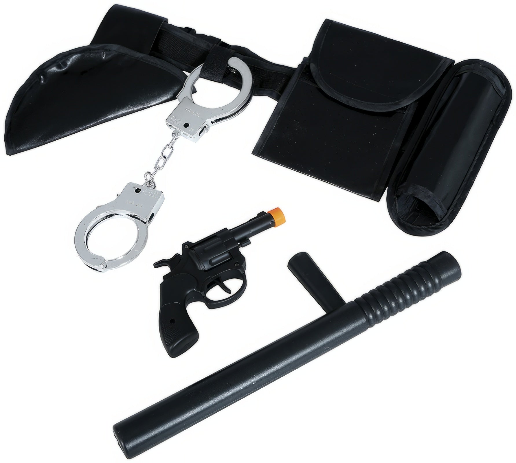 Inhoud: Riem, pistool, wapenstok, handboeien - Kleur: Zwart - Brandvertragend: Ja - Materiaal: Polyester, Pvc