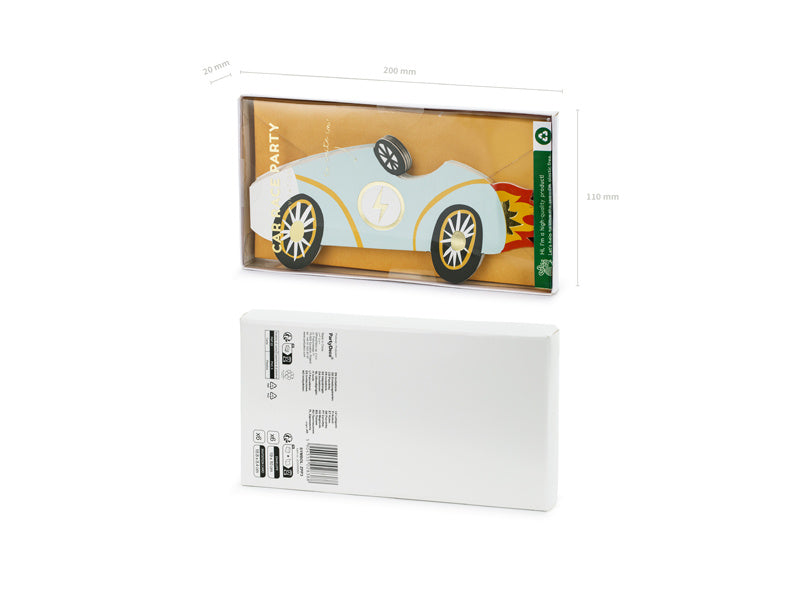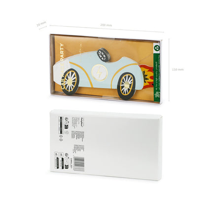 Uitnodigingen in de vorm van een auto, kleurenmix, formaat ca. 18,8 x 8,4 cm, set bevat enveloppen. (1 pkt / 6 stuks)