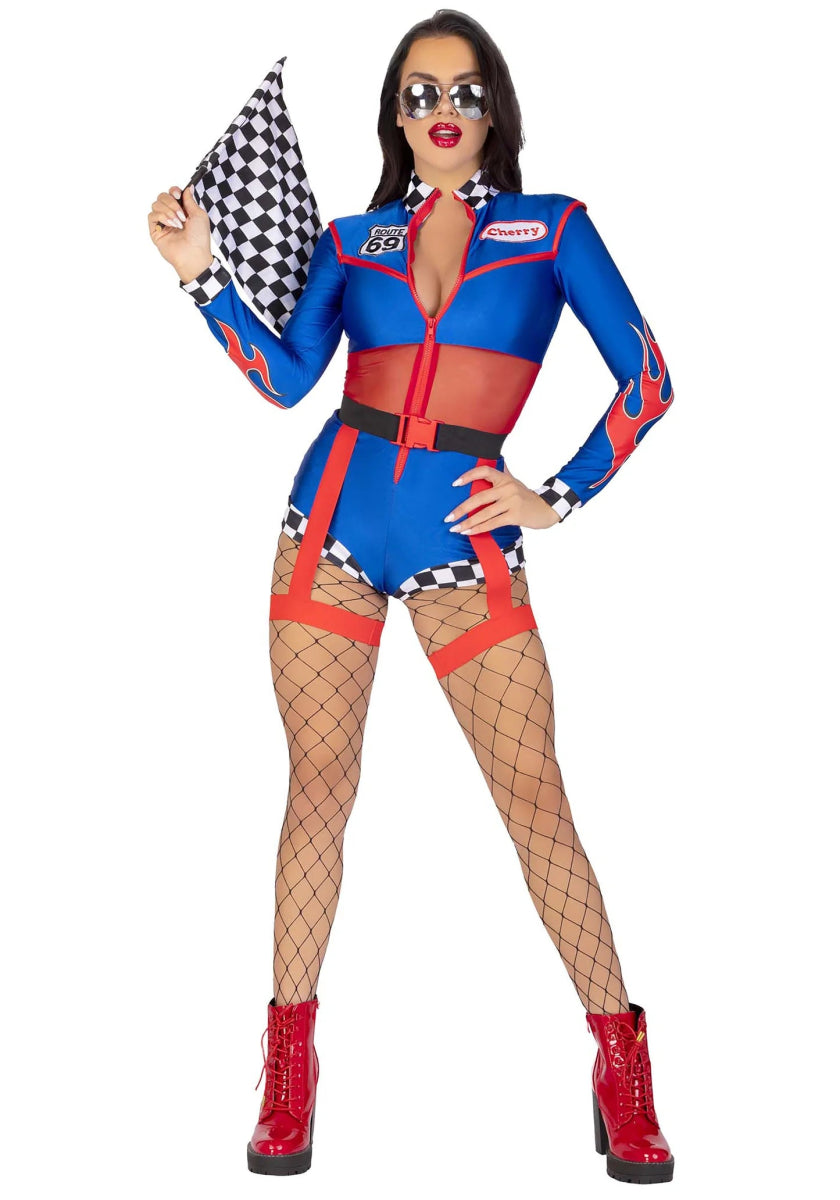 Bepaal de regels tijdens een motor- of autorace in het 2-delige Cherry Bomb Racer kostuum van Leg Avenue! Dit opwindende kostuum bevat een romper met ritssluiting, een riem met aangehechte jarretels en badge-accenten. De romper heeft een vlammenpatroon op de mouwen en sexy doorschijnende stof rond de taille. Perfect voor een themafeest of Carnaval, deze set laat je stralen als de ultieme race diva! 🚗💥