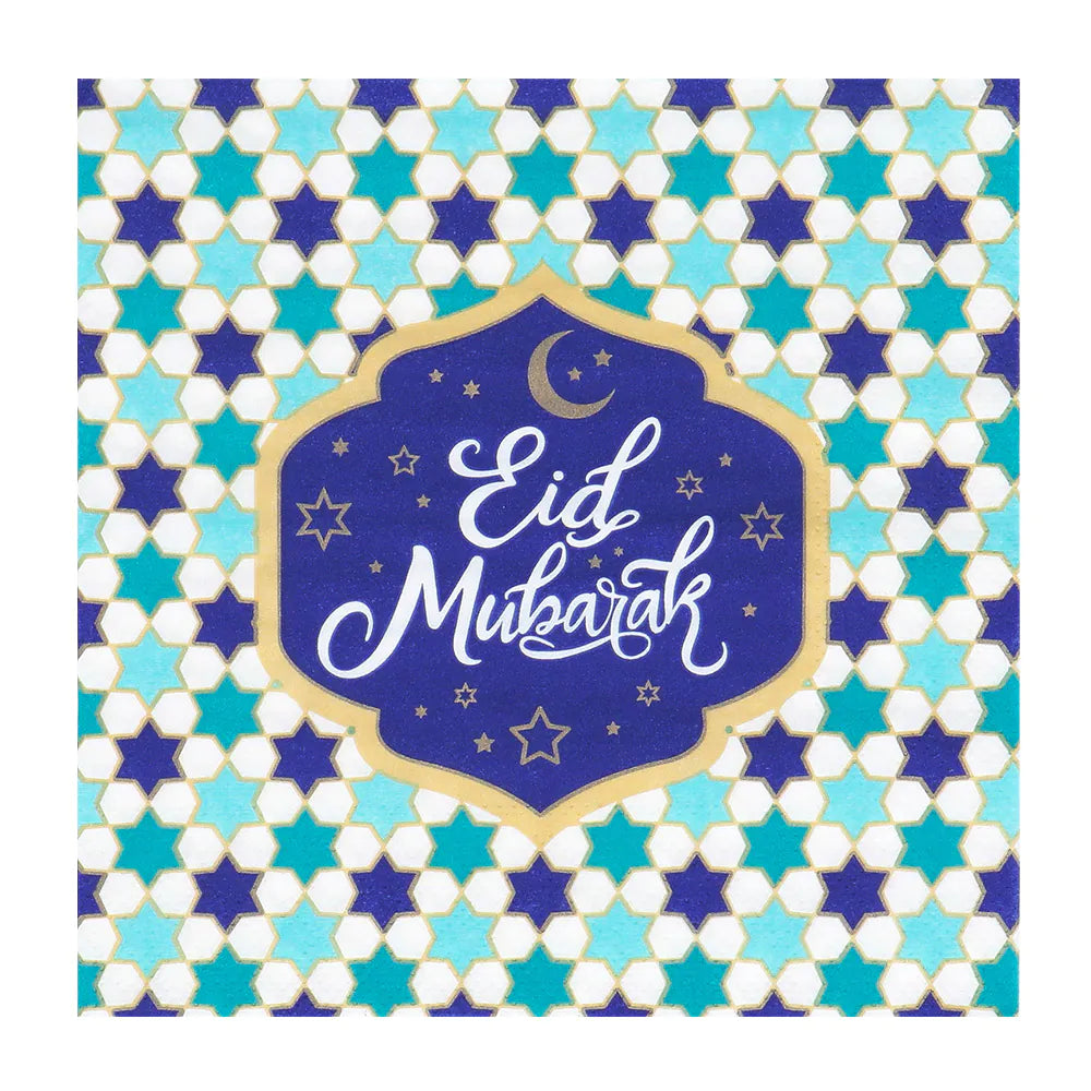 Plaats de papieren servetten met Eid Mubarak opdruk als charmant onderdeel van je tafelschikking en creëer een moment van genot, terwijl iedereen samenkomt voor een heerlijke maaltijd. Deze servetjes voegen een vleugje elegantie en vreugde toe aan elke eettafel.