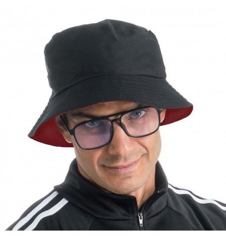 Inhoud van de set: 1 omkeerbare bucket hat (zwart/rood), 1 bril