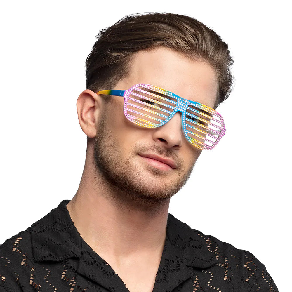 Een kleurrijke shutter partybril voor festivalgangers, feestbeesten en 90's fanaten. De coole lamellenbril heeft vrolijke regenboogkleuren en is versierd met glimmende steentjes voor een glamour touch. Een leuke accessoire voor een retro 90's outfit voor Carnaval, een fout feest of themafeest.