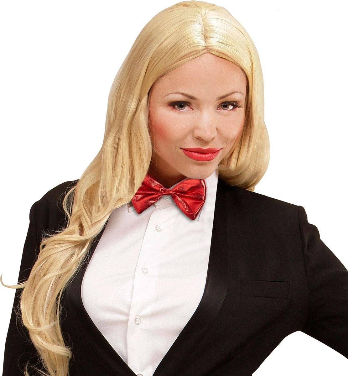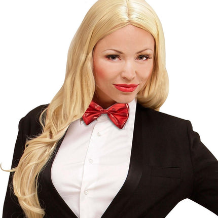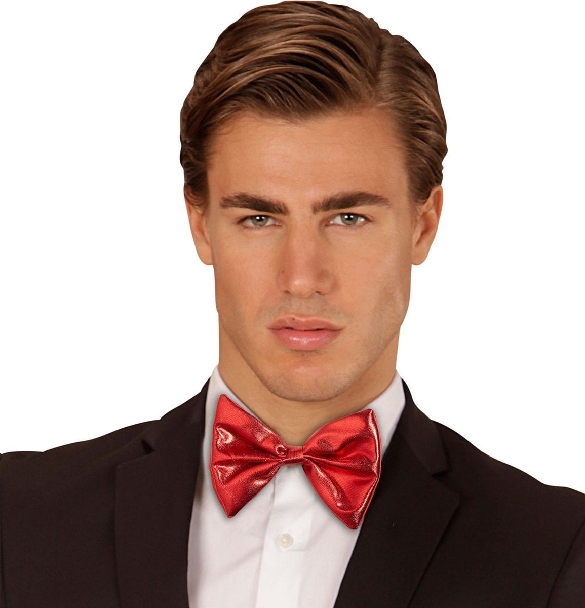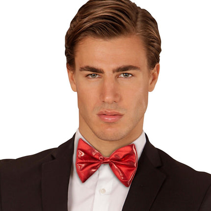 Deze vlinderdas is voor volwassenen. Het is gemaakt van metallic rood stof. Het strikje is ongeveer 7,5 x 11,5 cm groot. Het kan bevestigd worden met een rood elastiek rondom de nek. Deze strik zal ideaal zijn voor het compleet maken van een kostuum tijdens een chique themafeest!