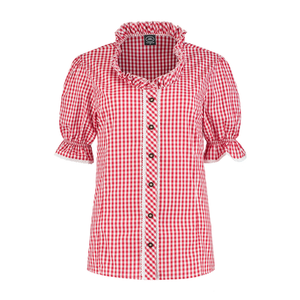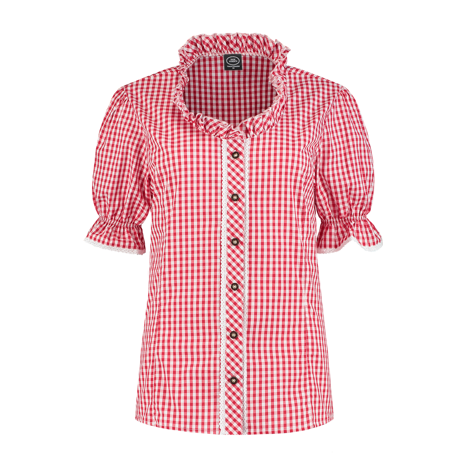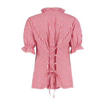 De blouse heeft traditionele knopen aan de voorkant en een vetersluiting aan de achterkant.