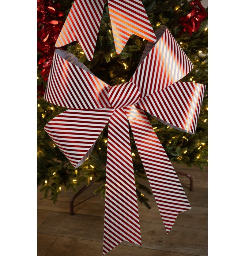 Breng een vrolijke en feestelijke touch aan je decoraties met deze extra grote PVC strik met snoepstrepen. Het royale formaat en de klassieke rood-witte strepen maken deze strik perfect voor kerstversieringen, cadeaus of feestdecoratie.