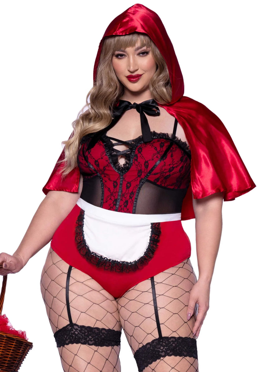 De wolf zal je zeker vinden in dit verleidelijke Naughty Red Riding Hood Plus Size kostuum van Leg Avenue! Dit betoverende 3-delige ensemble bestaat uit een kanten jarretel-teddy met doorschijnende details en een extra cheeky fit, een kanten afgewerkt schortje en een satijnen capuchoncape met striksluiting. Perfect voor een sprookjesachtig Halloween- of carnavalsfeest! 🌲✨