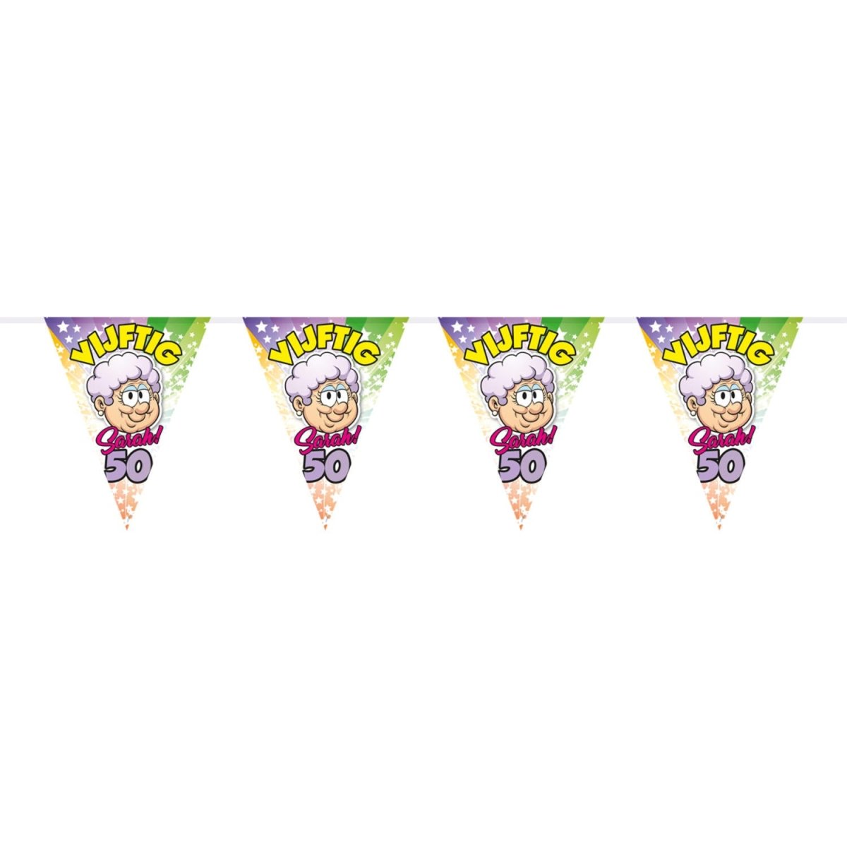 50 jaar Sarah Regenboog Vlaggenlijn - 10 meter. Inhoud: 1 vlaggenlijn. Kleur: Meerkleurig. Productthema: Sarah Regenboog. Bijvoorbeeld te gebruiken tijdens de volgende feestgelegenheid/feestgelegenheden: verjaardag, Sarah. Deze slinger is 10 meter lang. Het artikel is gemaakt van plastic.