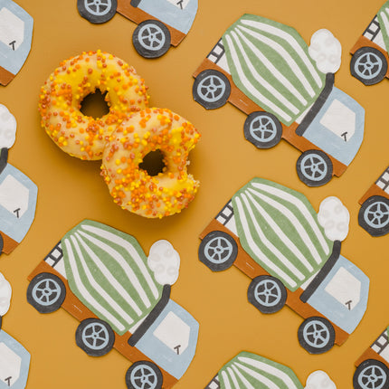 Papieren servetten Betonmixer, kleurenmix, afmetingen na uitvouwen ca. 32 x 26 cm, afmetingen na vouwen ca. 16 x 13 cm.