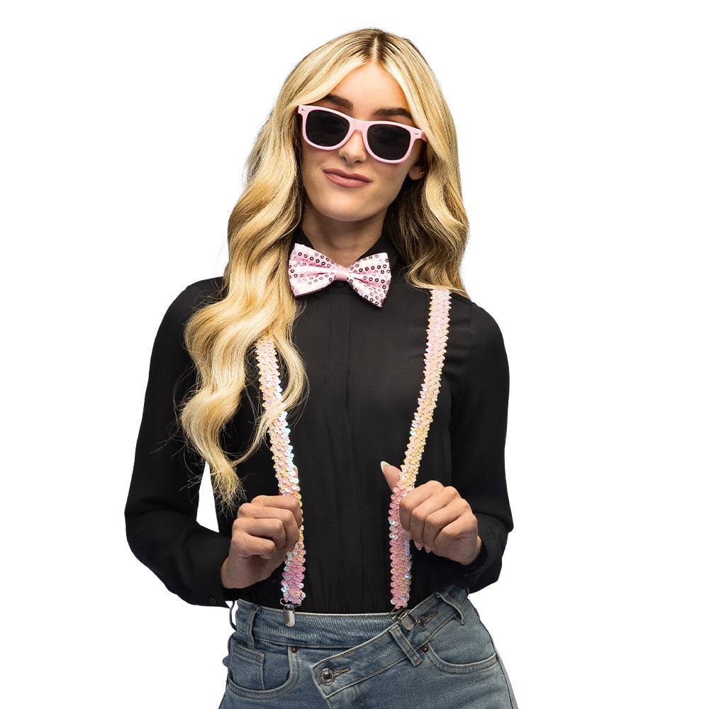 Steel de show met deze sprankelende 3-delige lichtroze partyaccessoire set! De set bevat een glinsterende bril, een bijpassende vlinderdas en feestelijke bretels – allemaal perfect op elkaar afgestemd. Ideaal voor themafeesten, carnaval, verjaardagen of elk moment waarop je wilt schitteren. Maak je outfit compleet en trek gegarandeerd alle aandacht!
